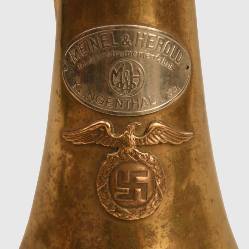 An extremely nice condition all brass and nickel bugle having the overlaid brass insignia of the SA with the original maker’s tablet in white metal above the SA eagle and swastika. Complete with its mouthpiece and hanging rings. Only very minor indentations to the lower part of the tubing.
