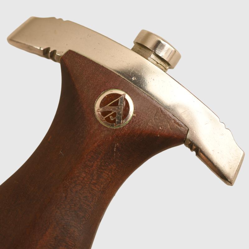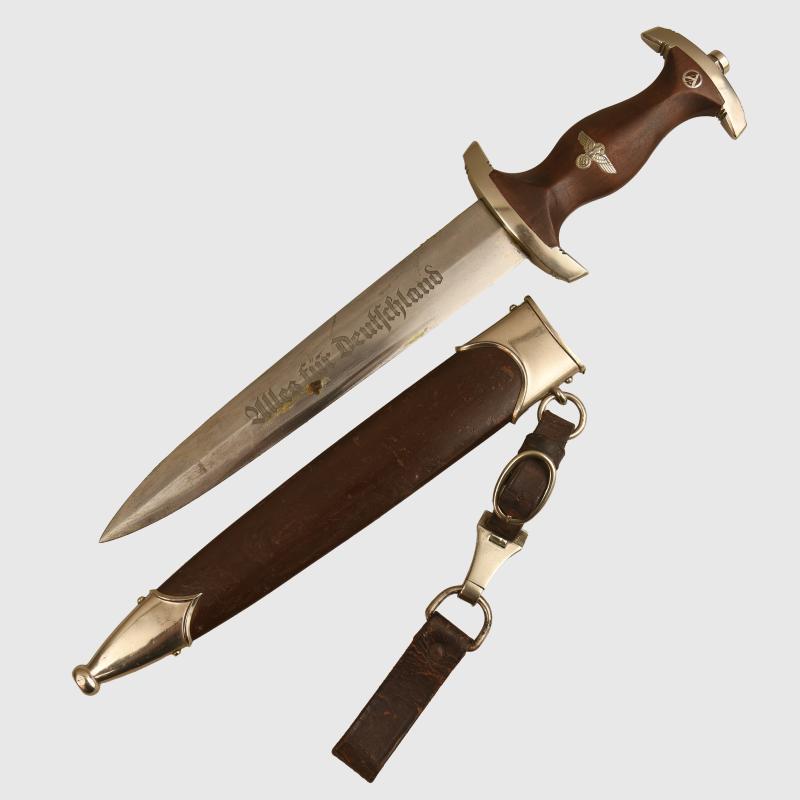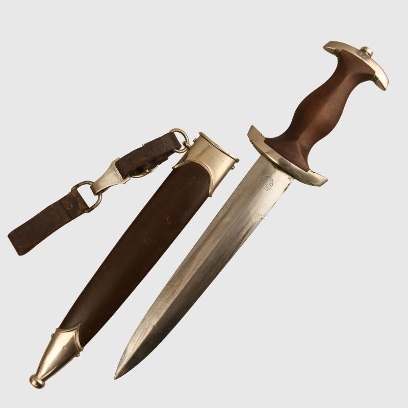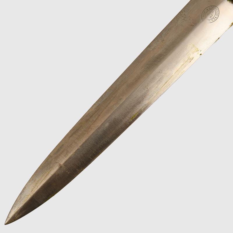 An excellent blade by Wustof of Solingen, the face side ‘Alles Fur Deutschland’ etching good and deep with much cross grain finish remaining to the blade and brightness. The reverse side, no lettering left where the Ernst Rohm inscription was originally laid. The grinding wheel has taken away the top part of the Wustof logo. Excellent quality upper and lower heavy nickel cross guards with an undamaged brown wood grip having a very high quality national eagle and undamaged SA inset. Very good fittings to the scabbard. One minor indentation to the lower ball. It would appear that the original brown anodising to the scabbard has had some form of lacquer laid over it. Complete with its leather strap and its belt loop. Group marked ‘WF’ for Westfalia on the reverse side of the lower cross guard. The sale of Knives, other Edged Weapons and Firearms are restricted to those aged over 18. Verification of age is required before purchase is concluded, this will include providing a scan of photo ID including your address and in some cases may require video verification by FaceTime or WhatsApp video, at Regimentals discretion, until formal laws on this requirement are enforced in the UK.