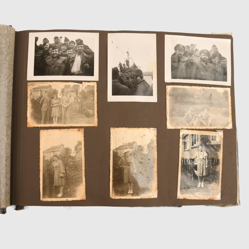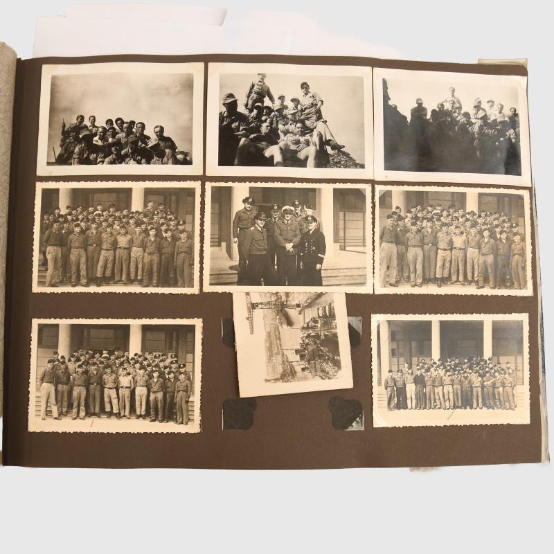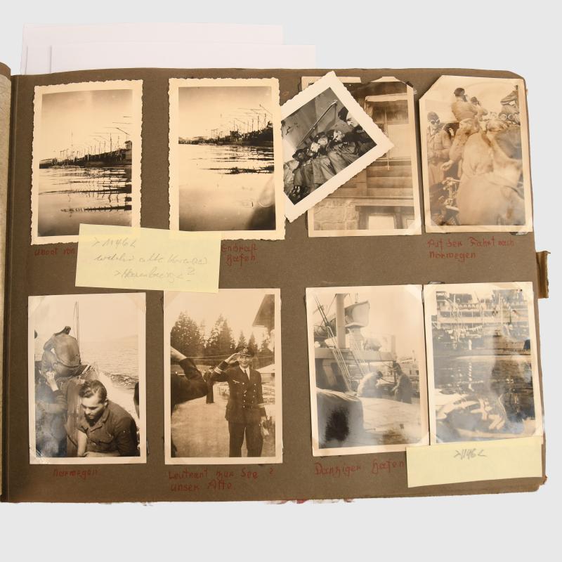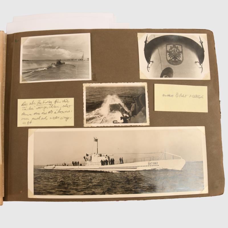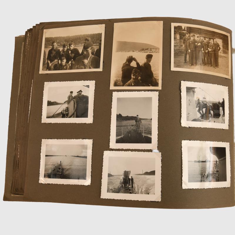 Two superb albums belonging to one submariner, a total of 501 photographs in both albums. The earliest album begins with images of a cruise possibly prior to his serving in the Submarine Service, in southern climates. Scenes of submariners at rest and sport, then scenes of a bullfight in Spain, this may be during the Civil War but no dates are annotated. The album then moves into Submarine Service, images of crewmen on deck wearing their grey deck leathers and Mae West lifejackets. The Commander addressing the crewmen. The images seem to be taken after a submarine cruise as most of the men are unshaven. Pictures on the flak gun on deck at sea, pictures of the conning tower anti aircraft gun, officers wearing white top caps. Various types of grey leather deck suits being worn. Shots back at their submarine base. Unusual shots of Kriegsmarine men wearing tropical visored field caps, location unknown. French chateau indicating it may be close to their base. Naval soccer scenes. A broad shot of a submarine with conning tower insignia visible, we have not been able to identify it. Excellent close-up shots of another conning tower insignia. Images of the famous Knights Cross Winner Lehmann-Willenbrock. Flowers being awarded to a submarine captain wearing his white top cap. Good close-ups of Naval Admiral congratulating one of the sailors on the deck of a U-Boat. Many other highly interesting submariner related images, both on deck on shore. Cartoon type postcards of flimsily dressed women. One very large format shot of the crew in their deck leathers on the deck of their submarine in port. A naval band actually assembled on the deck of a submarine playing. A small grouping of what appear to be post war images. The second album beginning with an image of the Battleship Scharnhorst. A beautiful long shot of a submarine, the submarine is the Type UA, which was built for Turkey but never delivered. More shots of Kriegsmarine personnel at rest. Dockside, large ships. Many images in this album annotated. U-Boat depot ships. Submarines on manoeuvres. Kriegsmarine barracks images, all annotated. Individual photographs of higher ranking officers. An image of a U-Boat officer, non annotated but appears to be Gunther Preen. Pictures of U-46 in dock. More close-up images on submarines. Submarines in the Kaiser Wilhelm Canal. One large image of the Battleship Graf Spee. Another image of the Graf Spee sinking. Internal shots, which were canteen purchased of the interior of the Linenshiff Robert Ley, part of the Strength Through Joy Organisation. Some of the last shots in the album are taken from the conning tower of the submarine while in heavy seas. Also images of other members of the conning tower crew at their stations. Two superb albums, worthy of much deeper research, and if possible extra viewing in person. More extensive, extra images can be seen on our new Premium website, type in regimentalsmilitaria.co.uk in to your web browser.