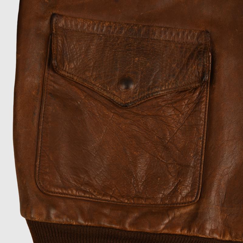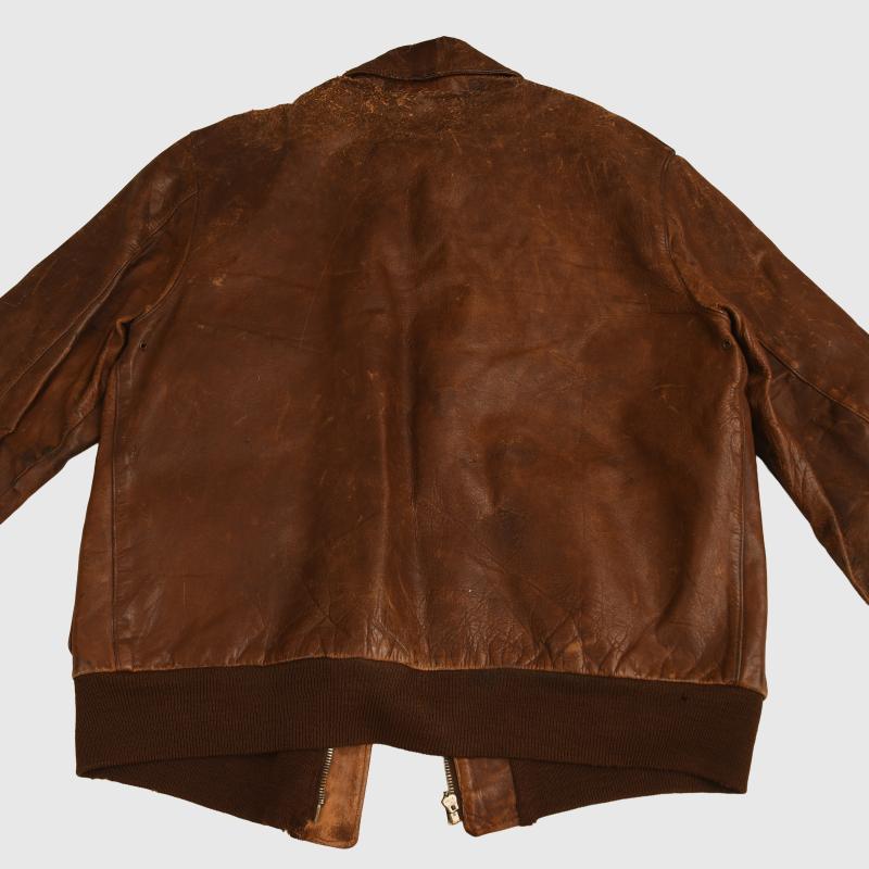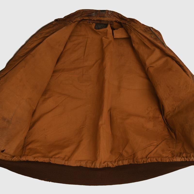 A very nice condition size 40 A2 leather flying jacket, manufactured by the Cable Raincoat Factory of Boston. Standard configuration, two front pockets with flaps secured by male/female pop studs, woollen bottom band and cuffs, collar secured with male/female pop studs, two faux epaulettes. The jacket has seen considerable combat wear but has no leather rot, stitching strong overall, the skin is slightly thin on the corner of both shoulders, lining good but the usual torn places around the upper inner rear collar area. The zip is manufactured by Kwik and is present and fully functional. Some tears to the cuffs and bottom band but are original to the jacket. The remainder of the lining is excellent. Painted to the front upper right hand breast are a set of bombardiers wings, a squadron patch below, which we have not been able to identify. To the left hand breast the outline of a Liberator bomber with a series of 35 bombs indicating 35 missions completed by this U.S. Army Air Force bombardier. We have been unable to identify the squadron patch. A rare jacket of WWII with the wearer completing 35 bombing missions over enemy territory, where a survival rate was very slim.