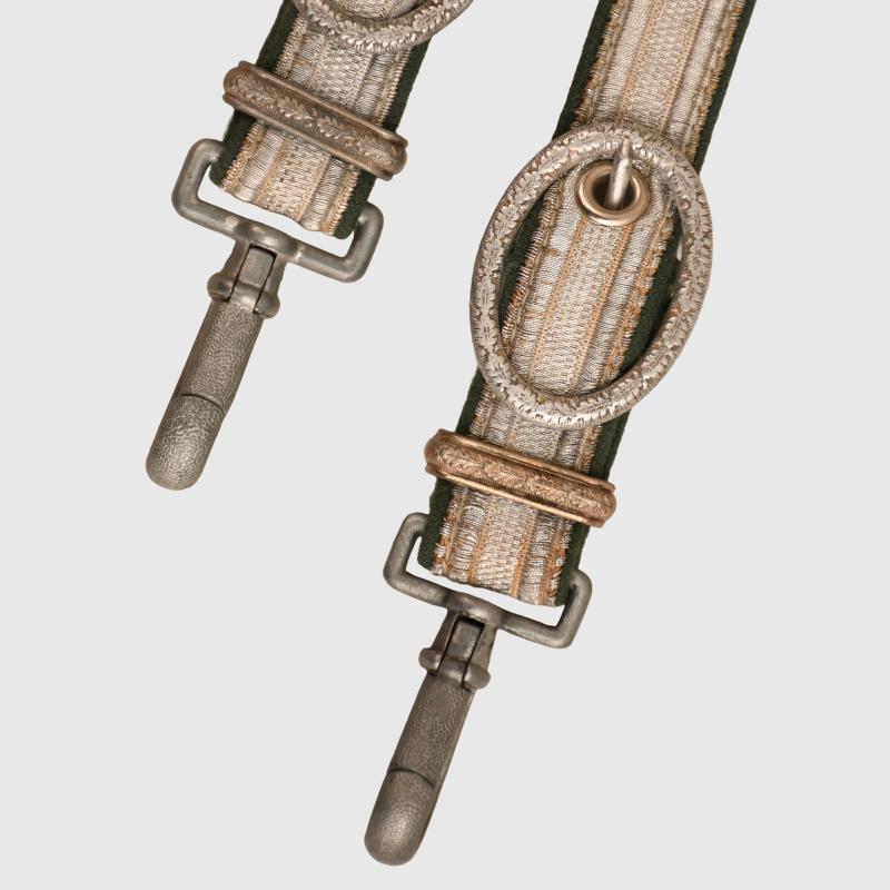 A very nice set, good bright silver brocade, good finish to the oak leaf oval buckles, both sprung loaded clips working correctly. Complete with its leather belt loop, the width of the loop is to fit through an under belt.