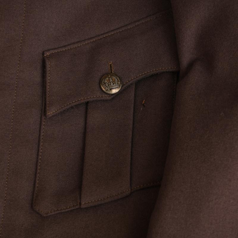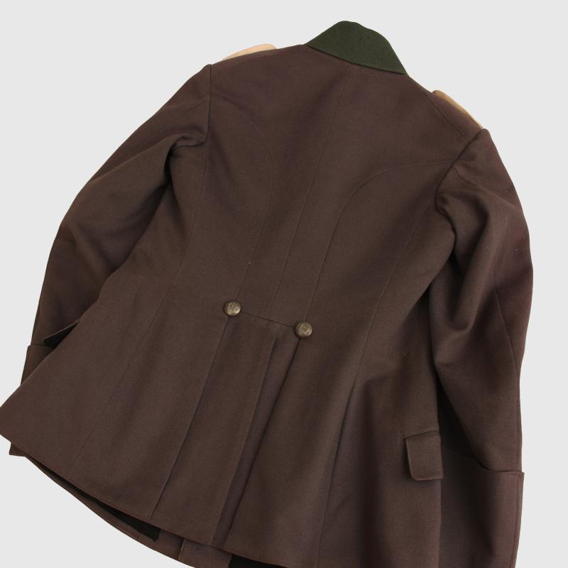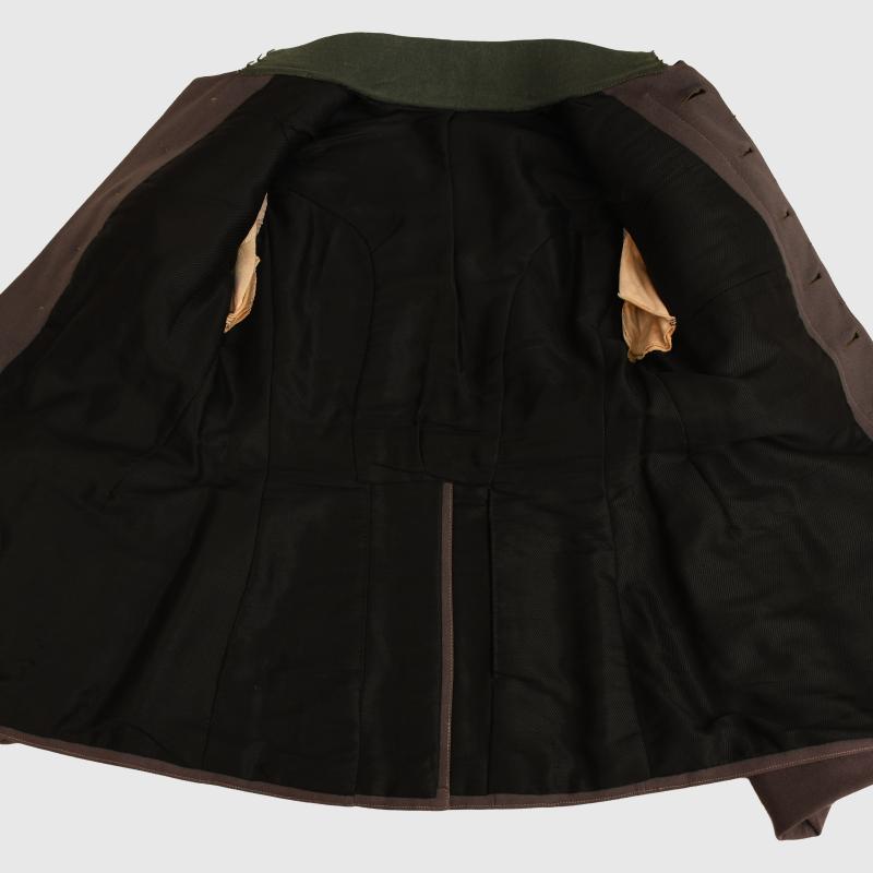 A very nice condition large size field grey leutnant’s tunic for Prussian Infantry Regiment No.9. The tunic is in a nice slightly lighter shade of field grey. Completely free of any moth damage or staining. Apple green stand collar. Stitch-in wide white underlay shoulder boards with Prussian black and silver fleck with gilded Regiment No 9 to each board. The tunic is basically M.15 style with fly front, deep turned back cuffs, M.15 skirted back. As the war progressed after 1915 officers were finding that the model 10 and 15 having just two lower pockets was not enough for the amount of items they had to carry whilst in the trenches, or in general service. Many officers when ordering tunics had them constructed with two upper breast pockets with flaps and pleats, the two lower pockets are identical to the M.15 and model 1910 style. A faded Iron Cross ribbon to the upper right breast, all the original buttons are in place, the lining absolutely complete. The traditional two inner hidden pockets in the rear skirt are present. Many images exist of these tunics being worn and they were especially favoured by aviation officers. This item sold by Regimentals some years ago and just re-purchased.