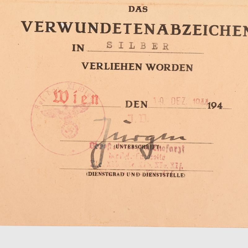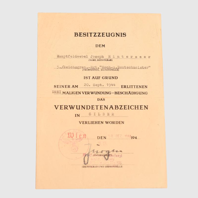 A rare award A5 size citation, folded once, a pair of documents, Wound Badge in silver with the full definition of the unit on the second line, dated ‘20th September 44’ with a doctor’s ink signature, accompanied by the Infantry Assault Badge in silver dated ‘30th July 1944’ with the ink signature of the Regimental Commander with the unit issue stamp. The Hoch-Und-Deutschmeister Regiment was named after one of the most famous regiments of the former Imperial Austrian Army. After being destroyed at Stalingrad it was re-formed in June 43 as the 44th Hoch Und Deutschmeister Infantry Division and sent to Monte Cassino in November, after spending 1944 in Italy it was transferred again back to the Eastern Front to take part in the German Plattensee Offensive to relieve Budapest.