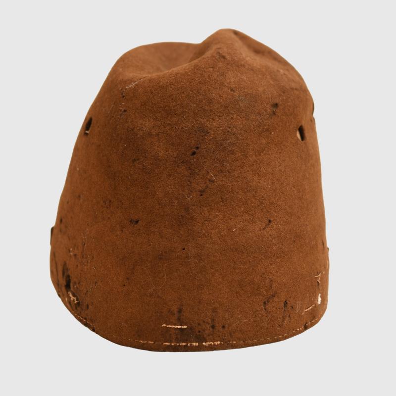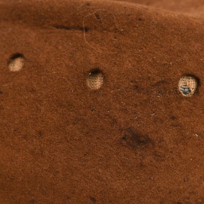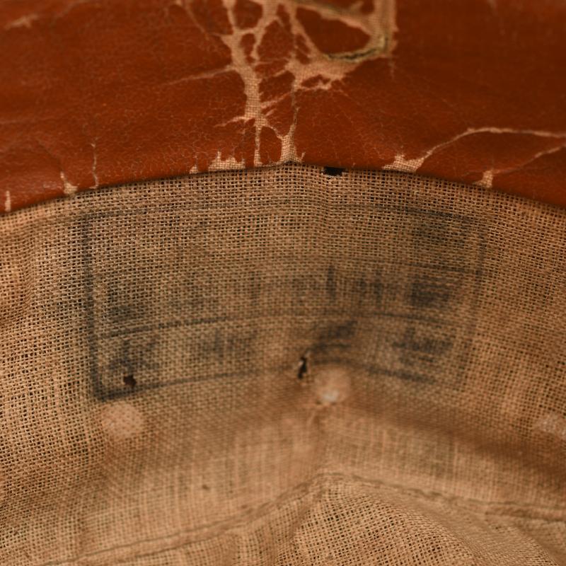 Staining with one moth hole. Kanji letters on the right hand side indicating a name. Three air vent holes either side. Complete with a strap, side buttons, yellow star to the front. Ersatz type sweatband complete but creased with many kanji stamps and letters to the interior.