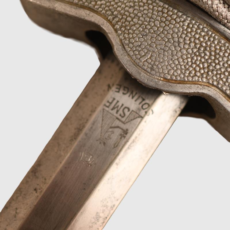 The blade is not abused, slightly dull. Good clear SMF and Luftwaffe acceptance stamps. All matching grey finish to the upper pommel, cross guard and scabbard rings. The main body of the scabbard being of a totally different material has retained its more steel finish. Two chips to the upper part of the deep orange grip. All grip wire complete. Short pattern portapee knot and the late pattern unlined brocade straps, which have frayed slightly. More extensive, extra images can be seen on our new Premium website, type in regimentalsmilitaria.co.uk in to your web browser.