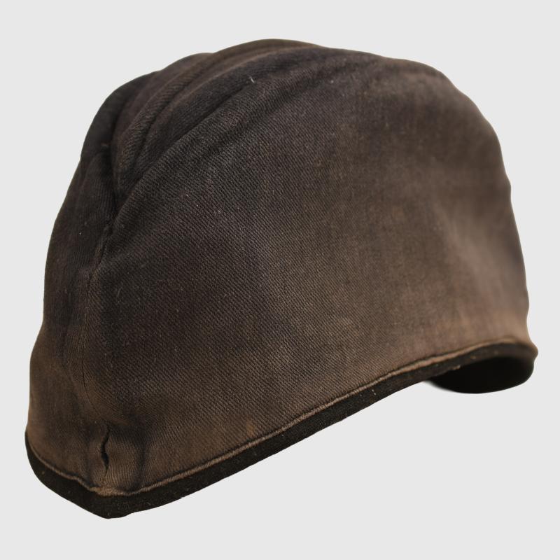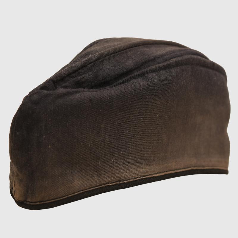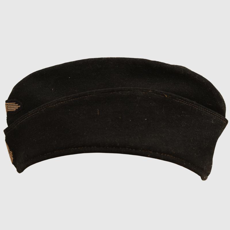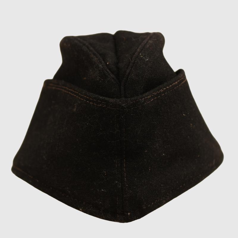 A very nice example of a Waffen SS black boat shaped overseas cap. A superb untouched example. The nap is thin in places to the exposed parts of the cap, on pulling down the side curtains the original nap of the cloth can be seen. The stitching around the boat shape and the base of the cap has rotted in places. There is no moth anywhere. On opening the upper envelope the nap of the cloth again excellent, as it has been protected, with its completely original Bevo woven Waffen SS skull and eagle. To the interior the dark grey bordering on black heavy duty cotton lining, no visible markings, on test we have approximated the size at 54 or 55.