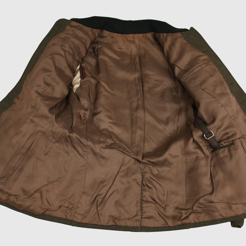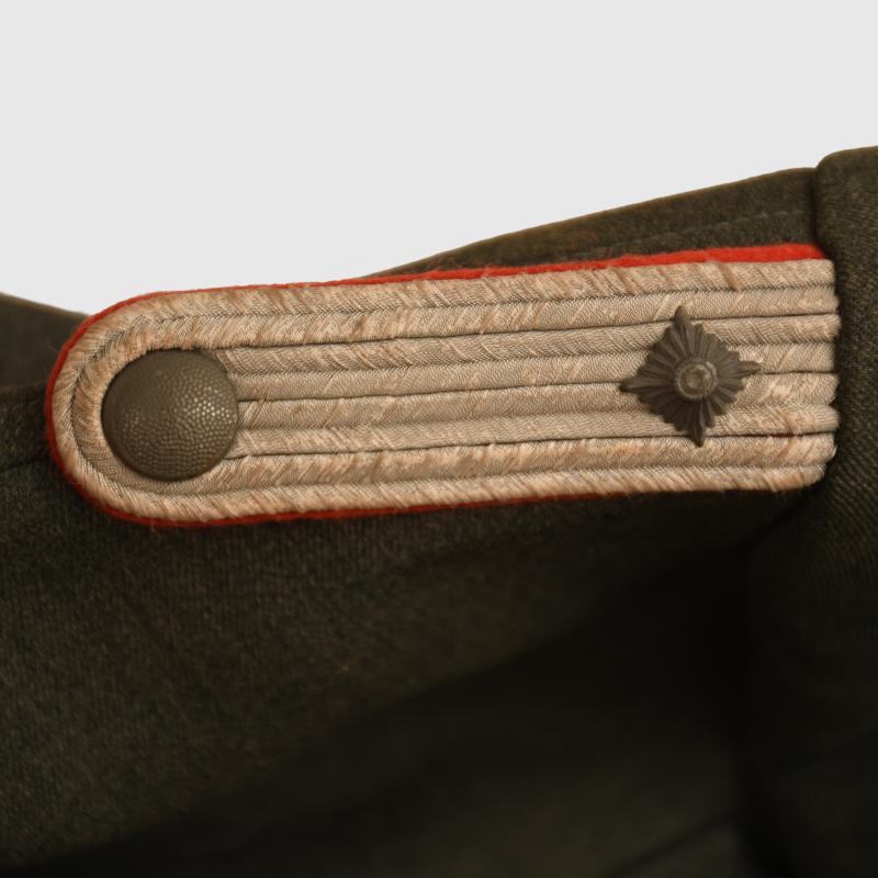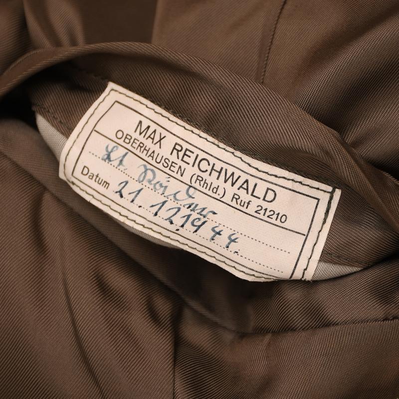 A very nice condition upper medium size four pocket combat tunic with scalloped flaps and pleats to each pocket. Deep turned back cuffs. One single small vent on the reverse side. Constructed in the heavy canvas type of material, very similar to the captured Italian cloth. Standard dark green officers collar. Fitted with a set of stitch in Oberleutnant shoulder boards with red artillery based waffenfarbe, slight oxidisation to the silver weave on both of the shoulder boards. Heavy bullion wire red artillery centred collar patches. Matching officers wire woven breast eagle with some threads slightly oxidised. Interior pocket with a ‘Max Reichwald, Oberhausen’ tailors label with the Leutnant’s name hand applied with the date ‘21st December 1944’. Unusual to find late war dated tunics. A single interior DRGM marked aluminium sprung loaded clip for the display of an army officers sword or dagger with a neatly tailored hole through the lower left hand pocket as the tunic is worn for the hanging strap to pass through. No moth anywhere on the tunic, damage staining or repairs. All of the buttons are the combat subdued grey painted variety.