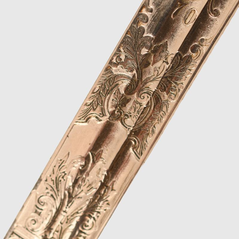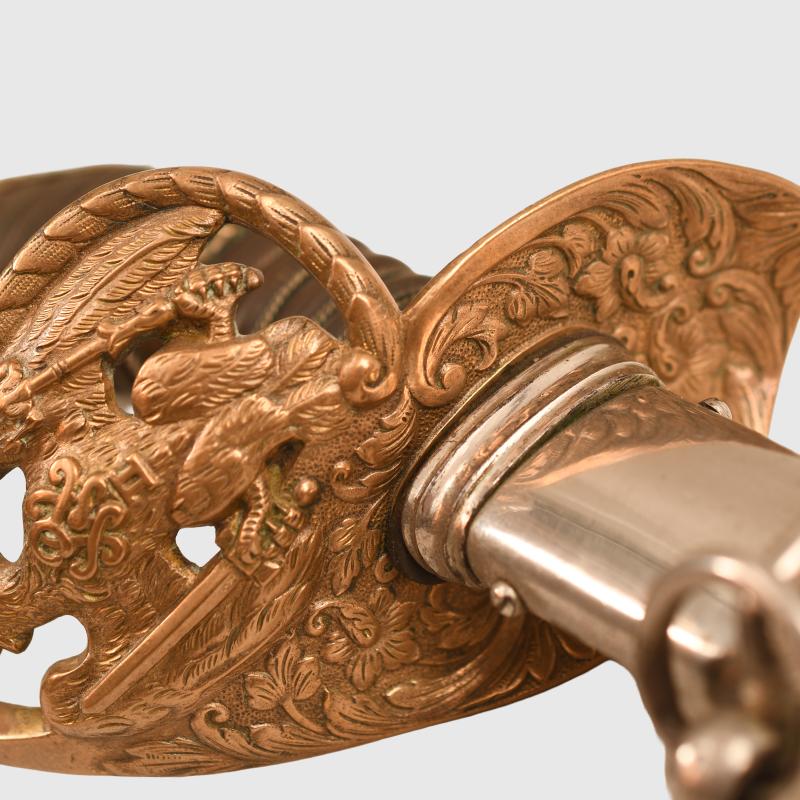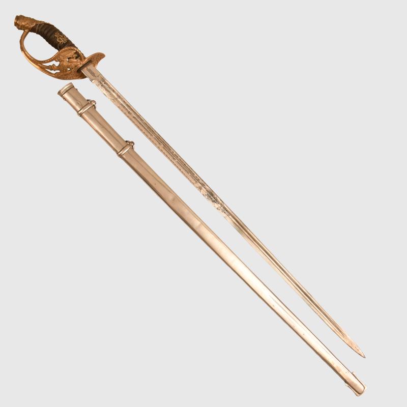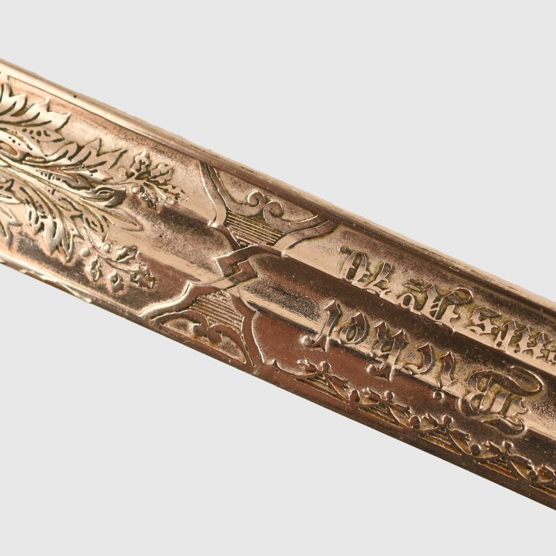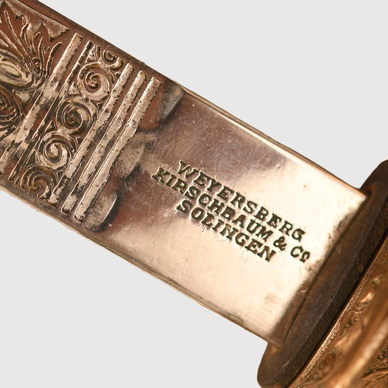 An excellent very long sword of the 1889 pattern. Extra detail to the 1889 pattern hilt, more than standard. Prussian eagle, stands of arms and flags to the upper cap area, also floriated to the inside of the bowl with the mirror image of the Prussian eagle on both sides of the bowl. Composition grip undamaged. Grip wire slightly loose. FWR motifs still fitted to the grip. The extremely long double fullered Weyersberg Kirschbaum & Co, Solingen manufactured blade with double line presentation script. ‘This sword presented to our retiring comrade Herr Oberstleutnant Bickel from the Officer Korps of the 8th Rhenish Infantry Regiment No.70’. The remainder of the blade having Damascus patterns visible. On the reverse side a central scroll reading ‘1892 to 1898’. Stands of arms and the Regimental insignia of Infantry Regiment No.70. The scabbard is in nickel, generally in good condition with one indentation just below the second hanging ring. Complete with its scabbard throat and fitting screws and double hanging rings. Along the flat back strap of the upper blade the name of the Berlin sword retailer.