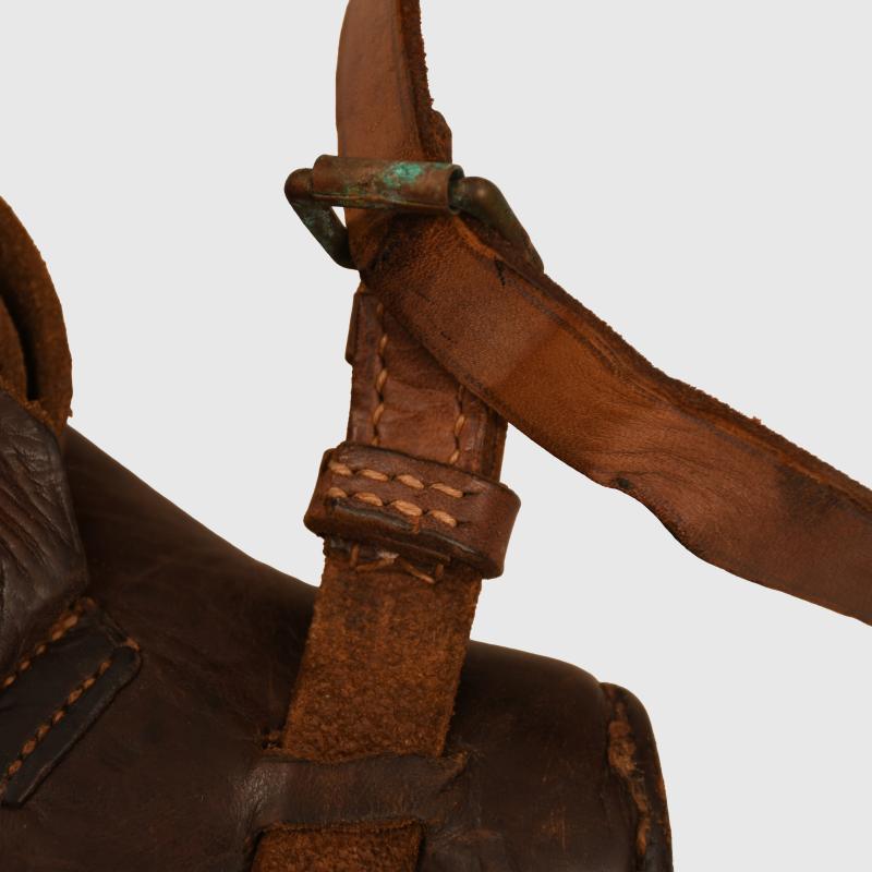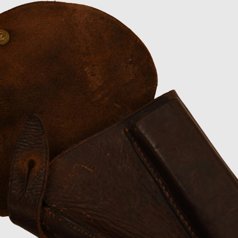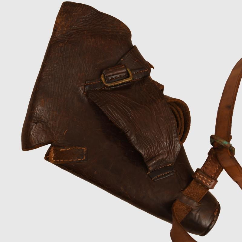 Fine quality British made holster with spare magazine pouch to the face side, complete with the long shoulder strap, which is complete but has become detached from one side of the holster and needs a repair. Another associated leather strap for the leg attached to the holster, some distortion to some of the leather around the flat area otherwise all stitching good and strong. Ideal for an RFC officer mannequin.