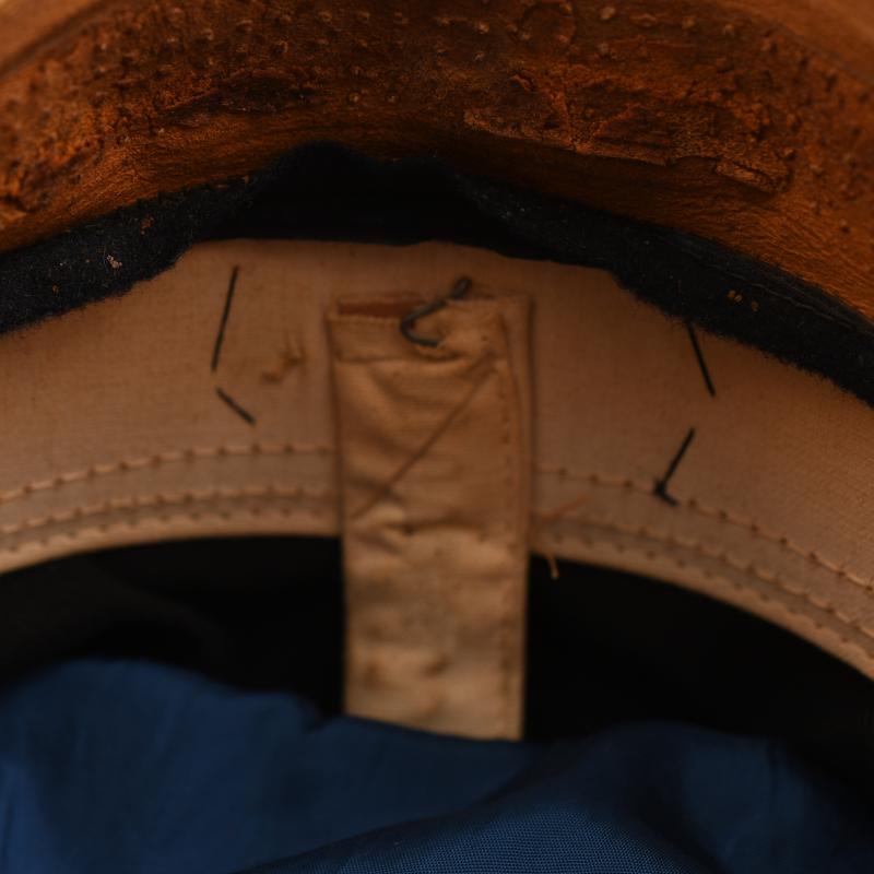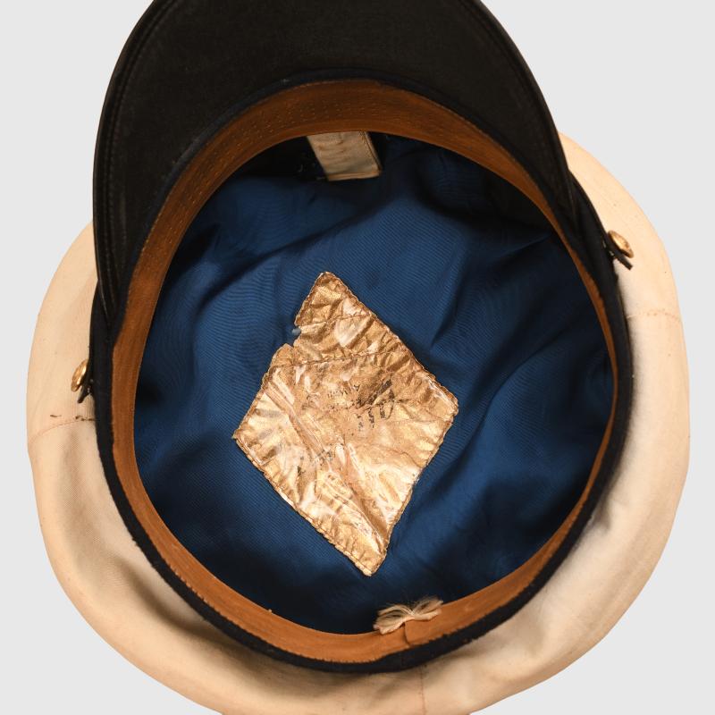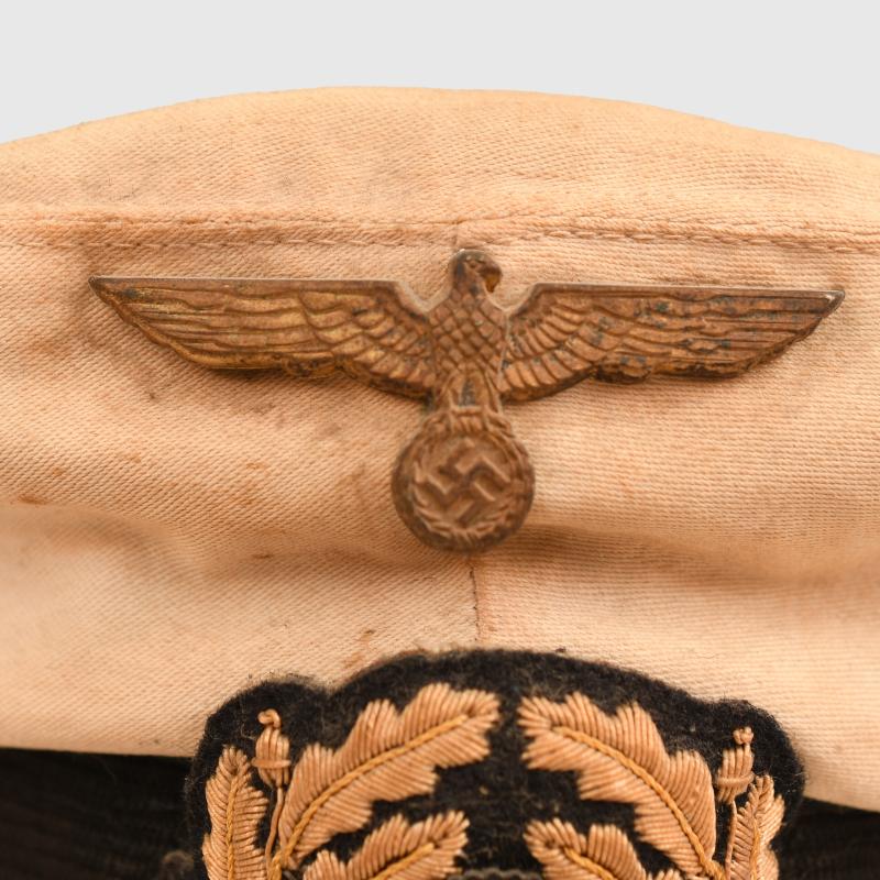 Removable white top over a standard blue cap, very large size, possibly 59 or 60. The white top has toned with age. Complete with its cellion national cockade, subdued gilded removable eagle, standard correct naval chinstrap with naval side buttons. Light tan leather sweatband, undamaged. The interior crown area is lined in blue with a centre celluloid lozenge with an underlay of gold. The maker’s logo below the celluloid is indecipherable, the orange cushion in the forehead area has solidified, By the form of the cap it appears to be a pre war produced cap in a style halfway between the Imperial Naval visor caps and the WWII Third Reich with the larger floppier top.