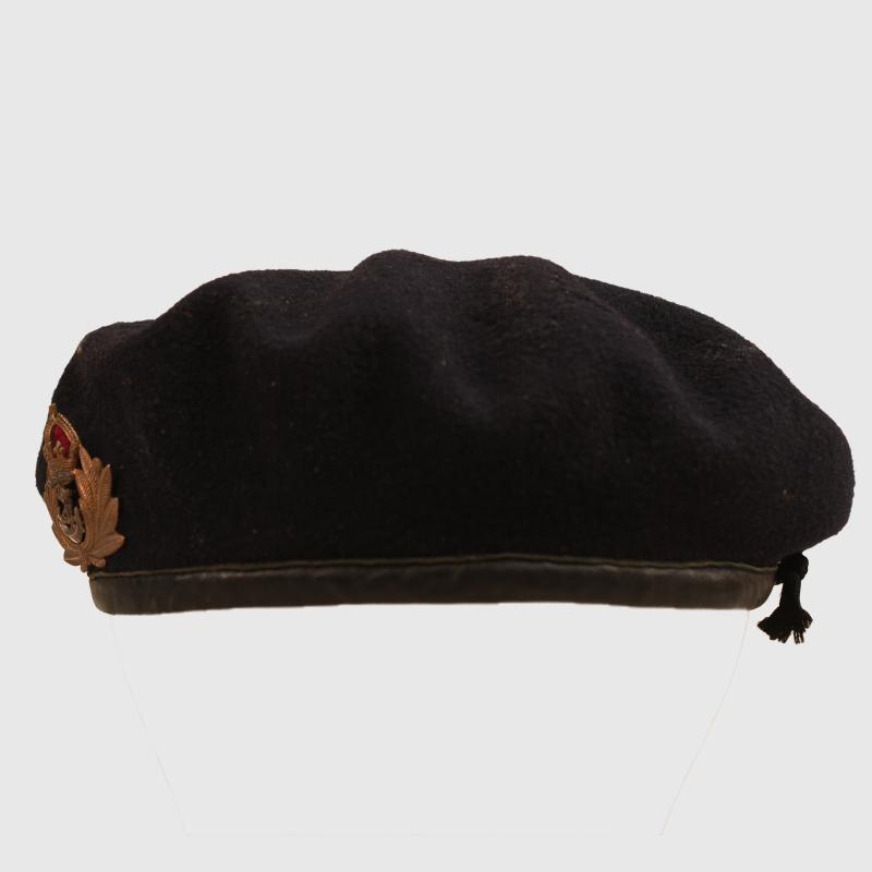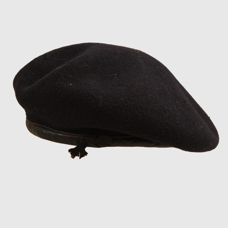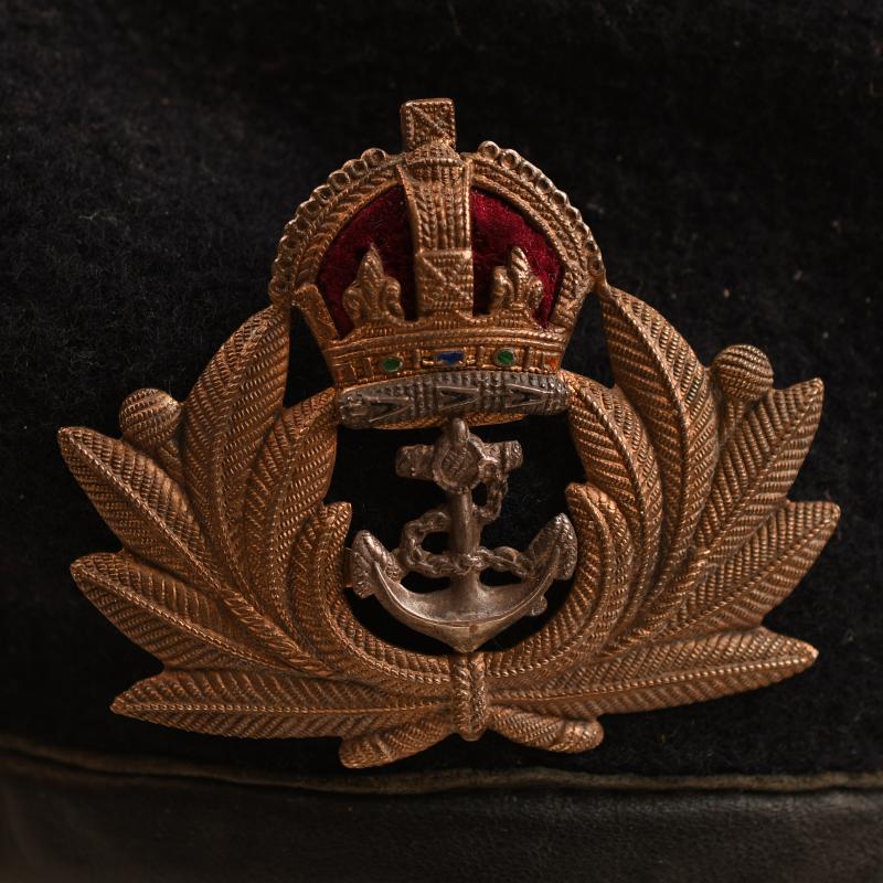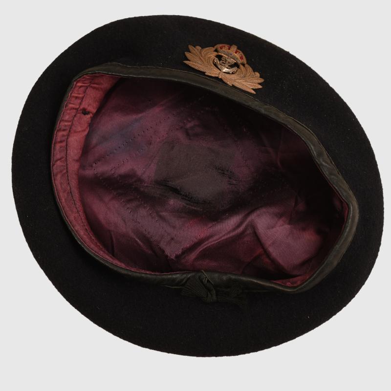 An unusual item of headdress from WWII being the Royal Naval officers beret. Standard dark navy blue with officers stamped economy cap badge. Officer quality lining, which has some wear. No dates or markings.