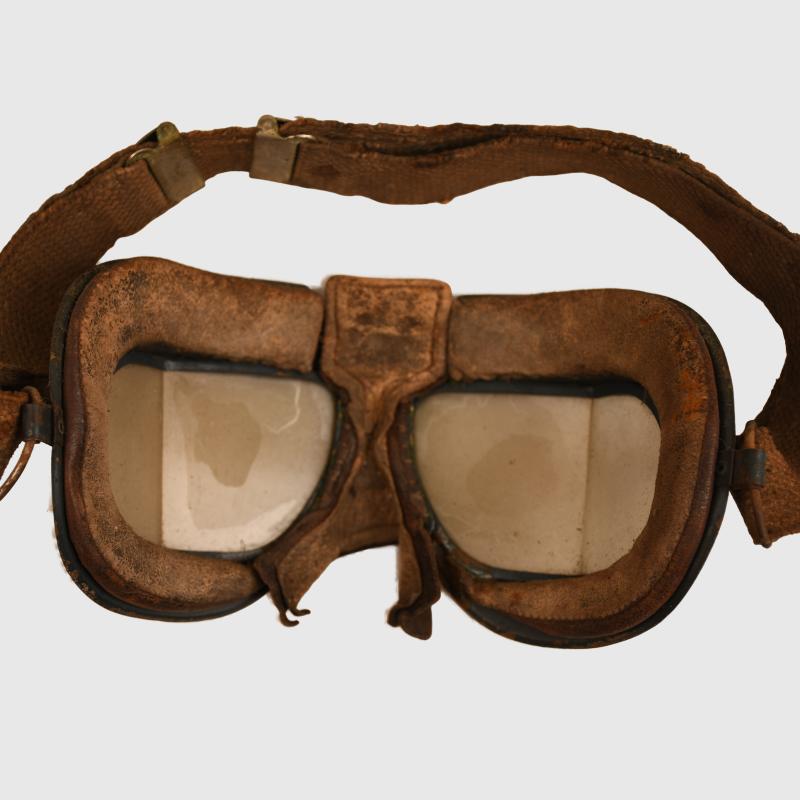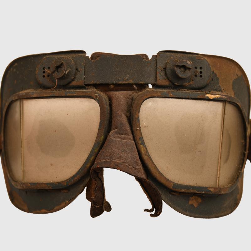Lenses very dirty, complete with elasticated strap. Good suede to the interior. Minus its flip-up shield. Remainder of nose leather good.