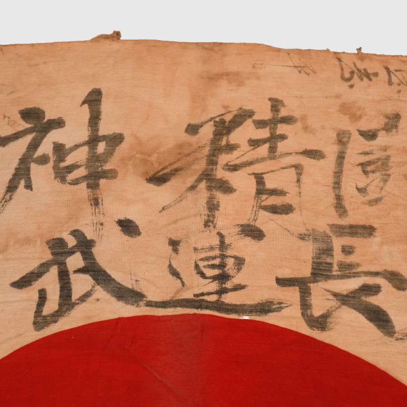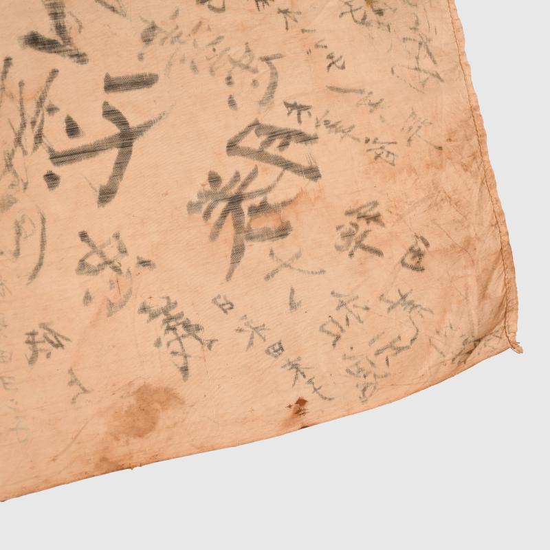 Unframed, 82 x 66cm. Quite a bit of age staining but no damage, both ties still present. Many signatures over the flag.