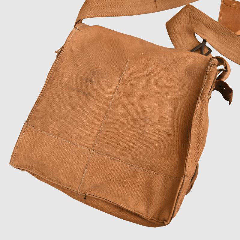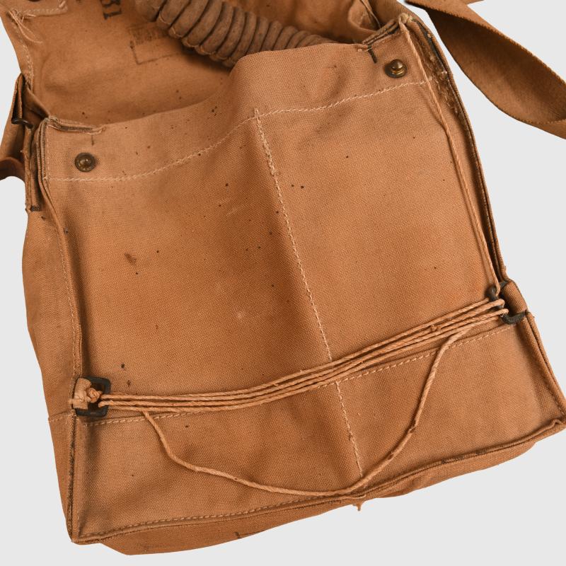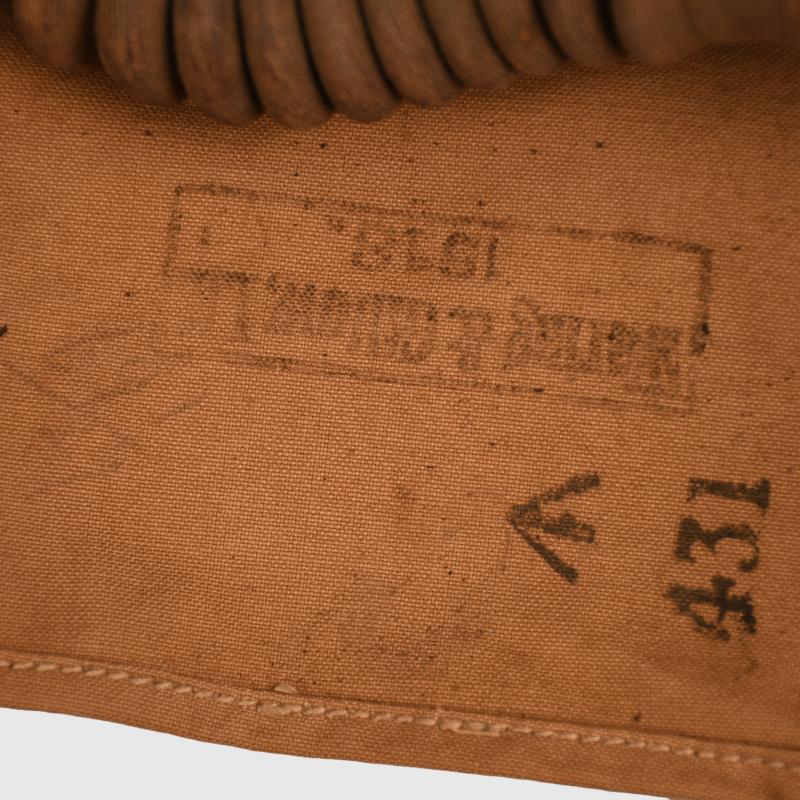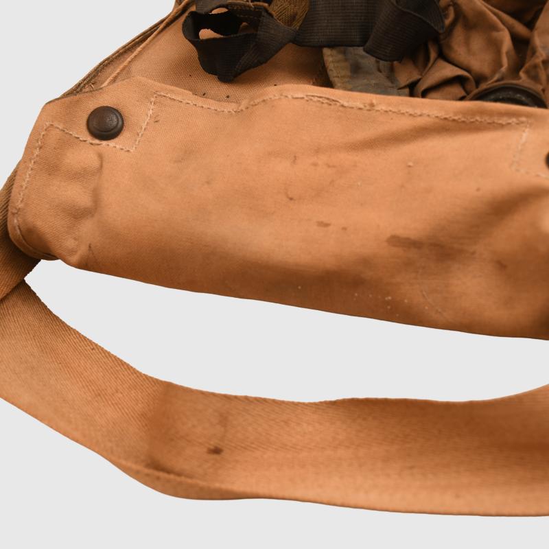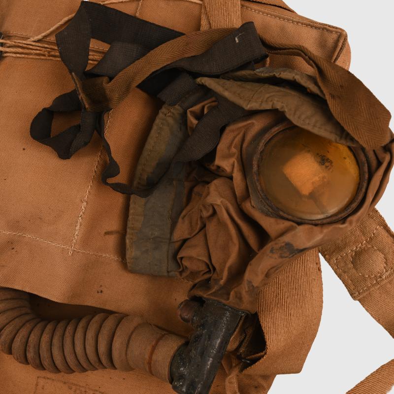 Excellent condition outer bag, broad arrow marked, stamped ‘Waring & Gillows 1918’. To the inner mask the canvas has solidified, all the head strapping present. The tube is good apart from one hole at the join to the filter. The rubber breather system has solidified and broken away from the face of the mask. The bag is complete with its strap and is still good for display on a WWI mannequin. Attached to the long strap is the original card envelope with the instructions for the use and maintenance of the gas mask indicating that this a stored mask and has never been issued.