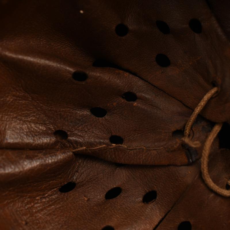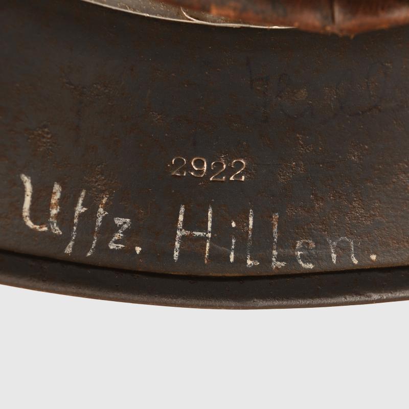 Lovely shell, stamped ‘Q64’ batch number ‘2922’ with original owner’s name of ‘Uffz.Hill’ hand applied in white paint to the inner rear skirt. The helmet retains all of its original Luftwaffe blue shiny finish. The Luftwaffe decal is good and clear with one abrasion across the top wing and slight thinness to the two lower arms of the swastika. The national tricolour has been rubbed away in accordance with the 1940 regulations but the white outer circumference is still visible. The interior liner in a nice good tan finish with its original drawstring. The chinstrap is of the correct period with the aluminium buckle and is maker marked.