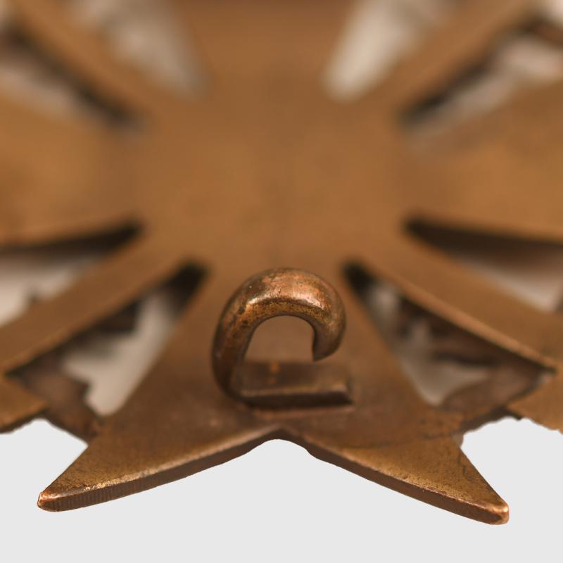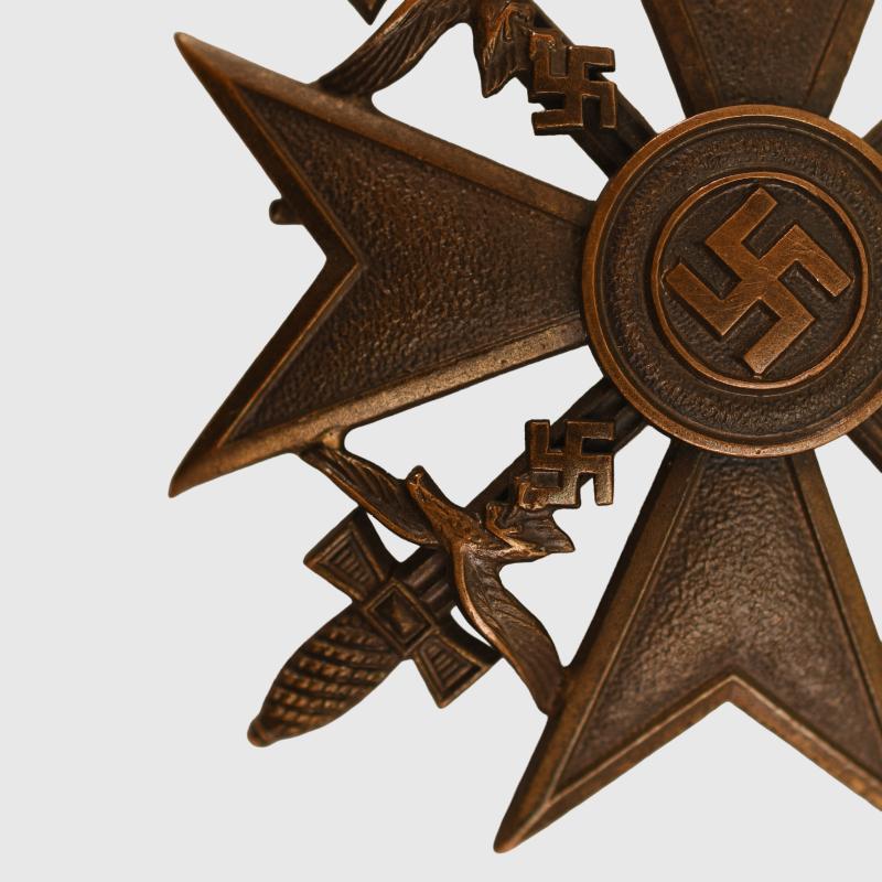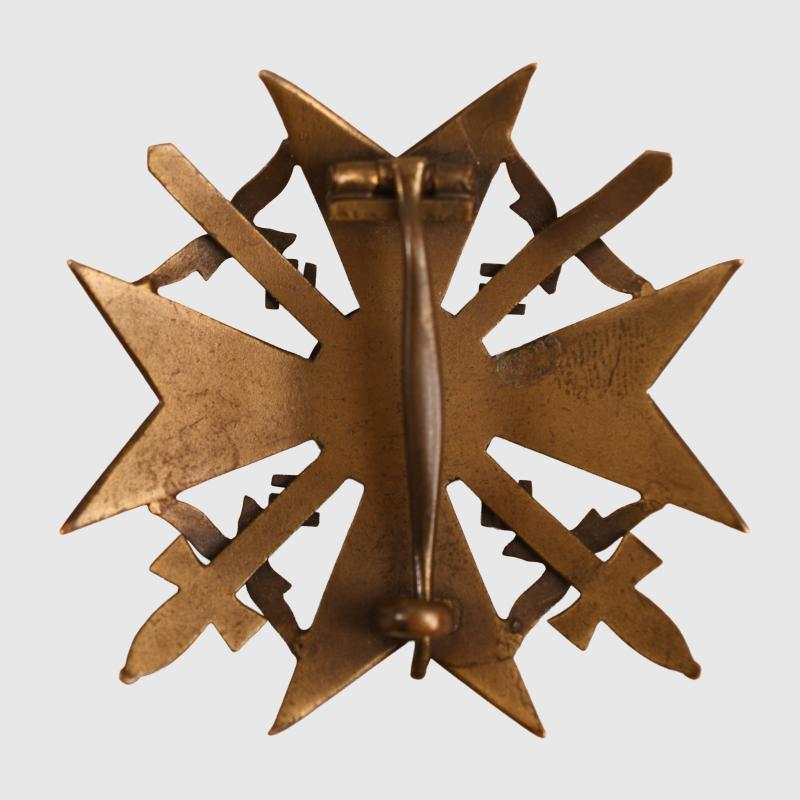 An extremely nice example of the Spanish cross in bronze with swords, the award retains 99% of its original bronze finish, cut out swastikas, very fine detail to the hilts of the swords, on the reverse side the original wide tapering pin, with its original hook and hinge, the pin itself has been slightly bent indicating to us that this is a service used piece, we have noticed over many years of handling medals and badges that on the actual service used items the recipients bent the pins to help them secure them to the uniform tunic more securely.