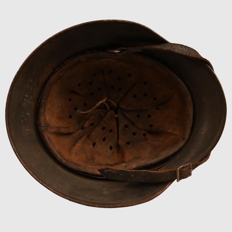 A good untouched size Q62 model 1935 double decal combat helmet that has been over painted in accordance with the 1940 regulations of eliminating the national tricolour. The army decal still good and clear, some minor loss of paint finish just above the right-hand side of the army eagle. The interior having a nice dry storage feel, the mid tan leather liner all complete, with its original drawstring, leather soft and supple. The chinstrap fitted to the square edged M 35 aluminium strap posts nicely marked E.A.S.40. Faint traces of the original wearer’s name painted into the rear skirt.