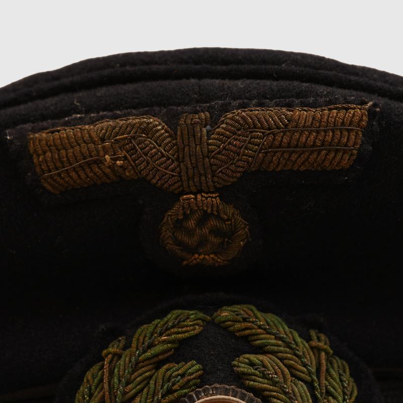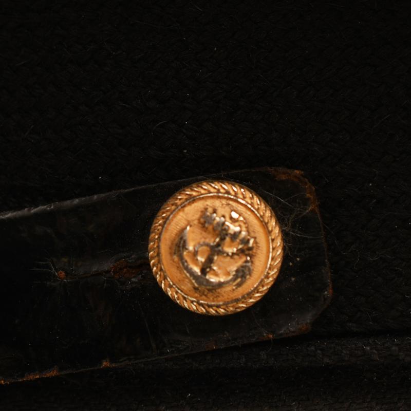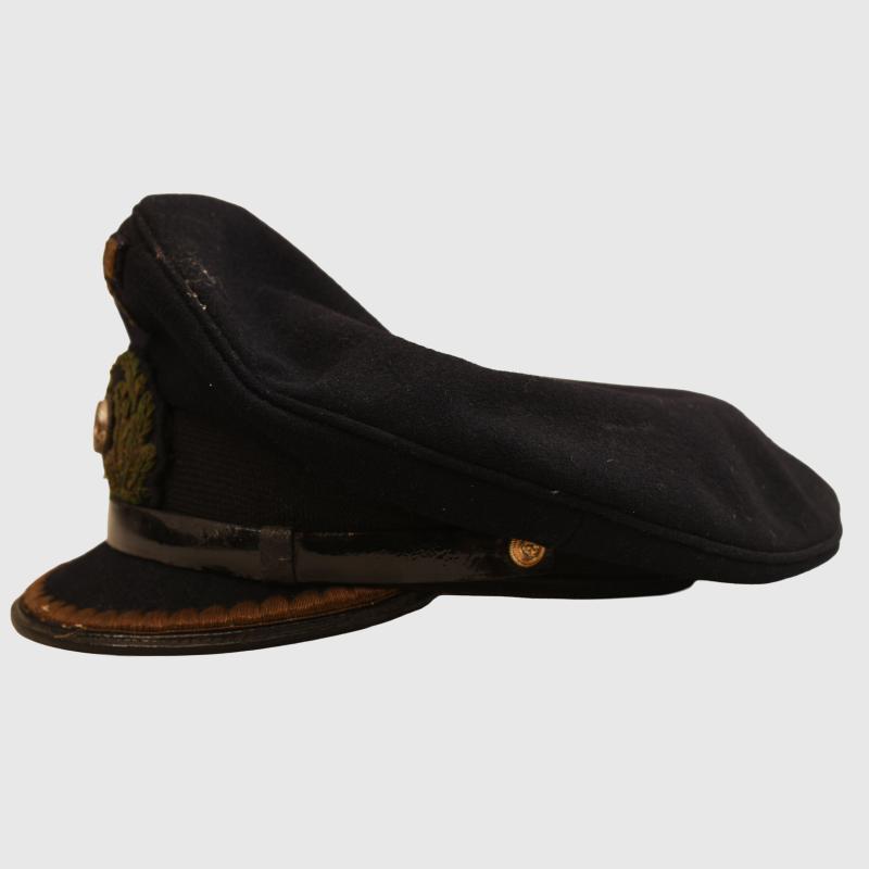 A nice condition good size, possibly 57 although not size stamped, standard junior naval officers floppy dark blue visor cap. Classic shape for a navy officer. No moth to the upper body of the cap. Gold wire national eagle with gold wire rank braiding to the front of the cap and gold wire weave to the central cockade, the cockade has oxidised to a green colour. The cap is fitted with its correct naval officers strap with twin gilded side buttons. To the interior the leather sweatband in light tan has evidence of considerable wear use but all intact. The complete inner lining of the cap is mid blue rayon with evidence of hair grease to the upper inner crown, which was never fitted with a protective celluloid lozenge.