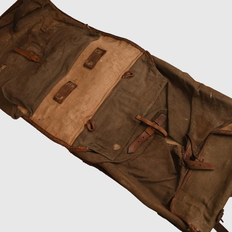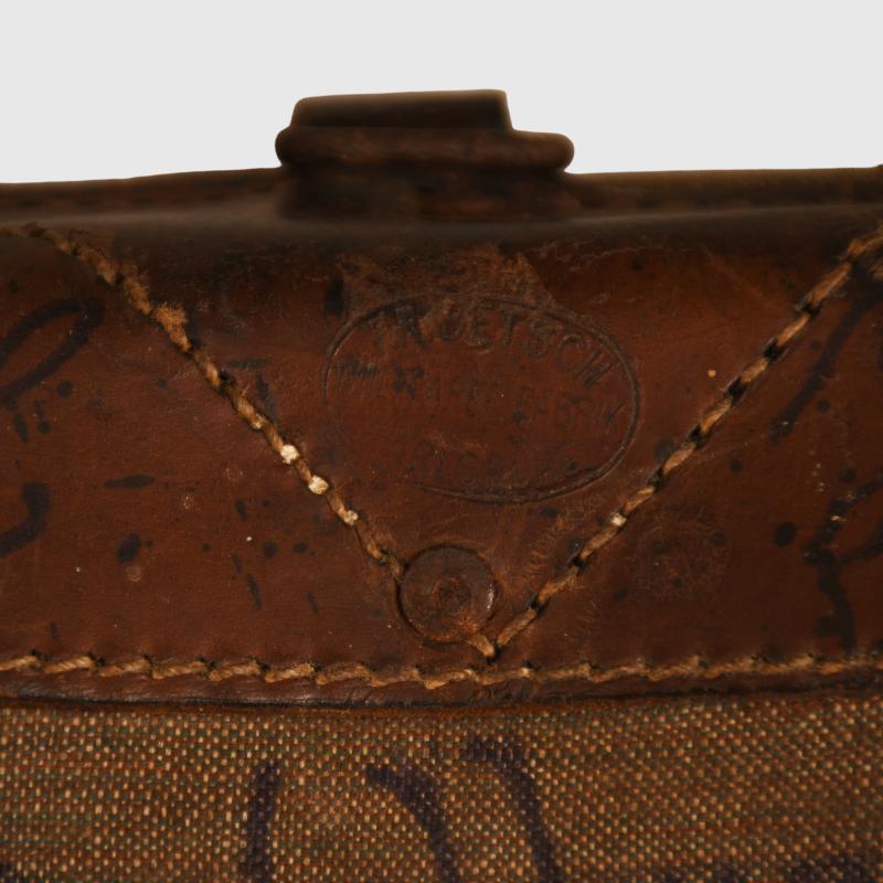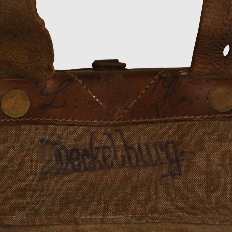 Mid war type in olive drab canvas and brown leather. Karlsruhe maker’s stamp on the top leather rear section and repeated on one shoulder strap, the opposite strap appears to be a replacement. Regimentally marked in red ‘J.R 88’ which is the 2nd Nassau Infantry Regiment No.88. Original soldier’s name ‘Deckelburg’ applied in backing on the reverse canvas. Some rodent wear inside, missing its ammunition cartridge clips and one pack ring. Some original trench mud in place.