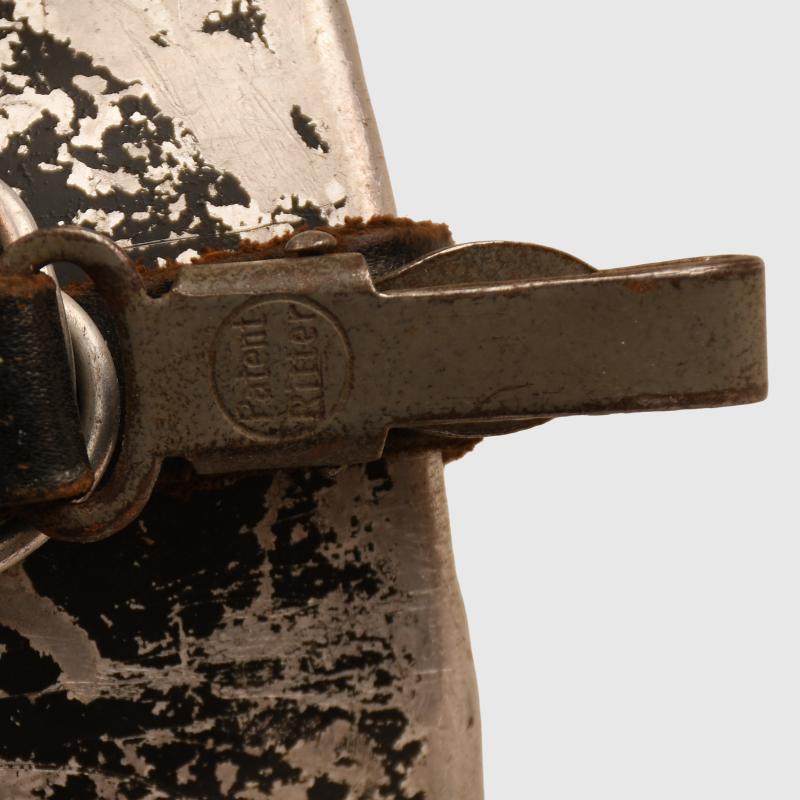 A badly moth eaten felt covered aluminium water bottle, the neck of the bottle is marked ‘SSS 8 39’ with its Bakelite screw top. All of the four closing press studs to the cover are fully operational. The leather strapping arrangement appears to be a replacement. Ideal for mannequin display or re-enacting. Aluminium swivel handled cup that has the majority of its black painted finish.