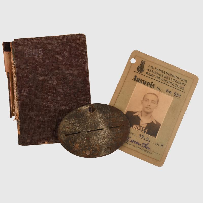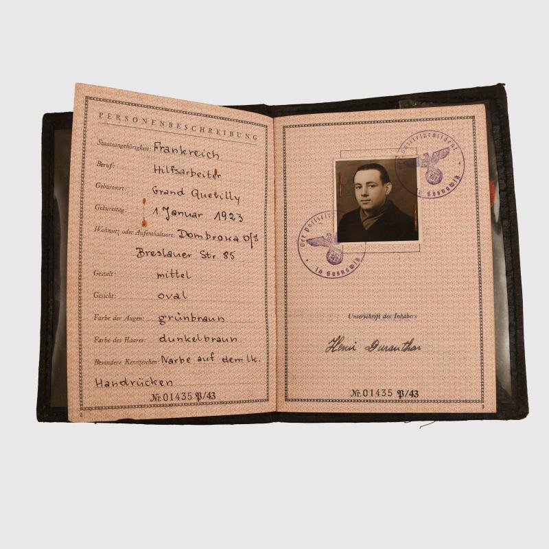 A very interesting grouping found in a French flea market recently, comprising the Vorlaufiger Fremdenpass, which is a temporary foreign workers passports. Al contained in a soldbuch pass holder with the silver embossed eagle and swastika to the face side with the word ‘Soldbuch’ below. The pass has been issued to a French citizen Henri Duranthon with a photograph of the recipient with the eagle and swastika over-stamps, the pass is dated ‘March 1944’. Within the pass there is a small quantity of loose paperwork, a restaurant menu, a German auslander pass, another pass Passierschein dated ‘1944’, a postcard from Perigueux in the Dordgogne in France to possibly his employers in Breslau in Germany, non posted, Perigueux is the area with the marketplace where this grouping was discovered recently. A further mixture of French and German documents and handwritten annotations. A further multi folded document very delicate in a mixture of Czech and German indicating he may have been working in one of the occupied lands. Further to the pass and its contents there is a separate ‘1945’ dated diary with many handwritten annotations, including many annotations around the date of the 6th/7th/8th, 9th May 1945. Lastly and possibly the most important items in the grouping his original plastic protected ausweis for him to enter the works on the I.G.Farben industries and the extremely rare identity disc to enter the I.G.Farben plant at Heydebreck. The I.G.Farben plant in Heydebreck in Pomerania, now in Poland was to create chemical plants capable of producing a new type of synthetic fuel. There were various camps for political and work prisoners in the area. The whole grouping is worthy of further research.