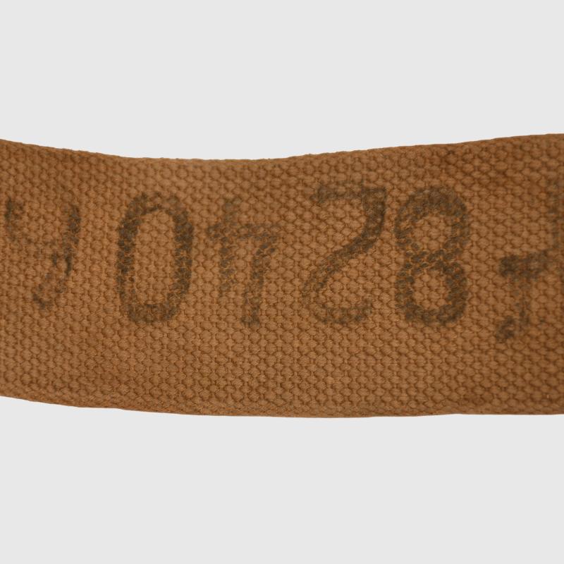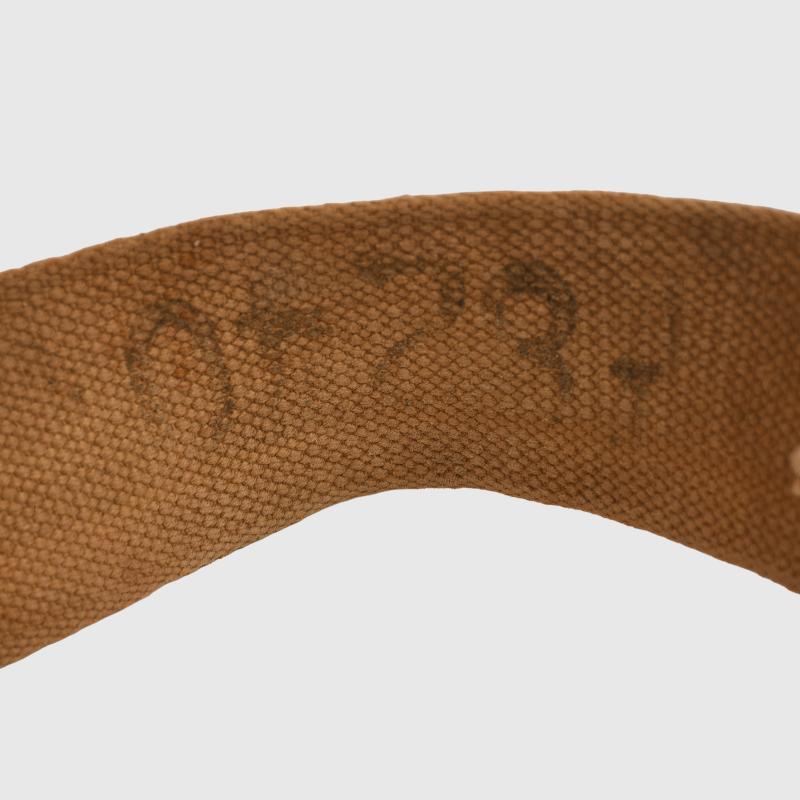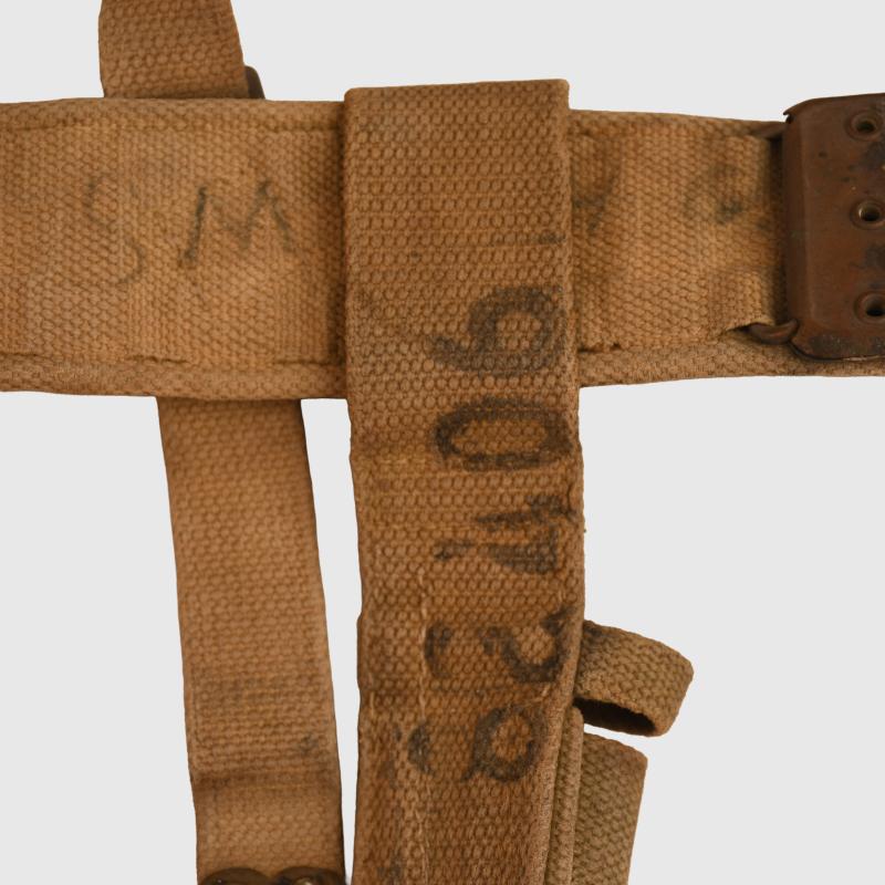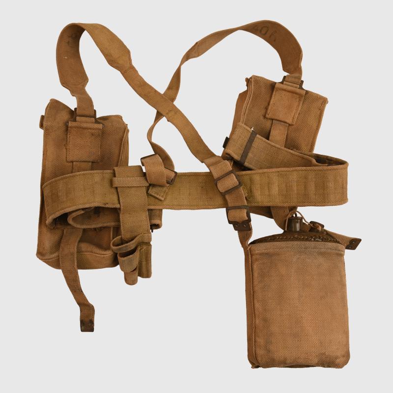 A blancoed set comprising the waist belt, two ammunition pouches, cross straps, water bottle and bayonet frog. Some visible markings, which appears to be a soldier’s number. No dates or other issue markings.