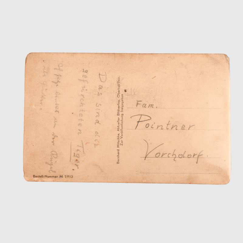 Postcard size, angled image of Tiger tank with a Commander in the turret wearing the black Panzer uniform. The reverse side not feldpost franked or stamped but partly addressed to the family ‘Pointner’ to a town in Germany, he appears to be saying this is my Tiger tank., describing it as the world’s most famous fighting vehicle.