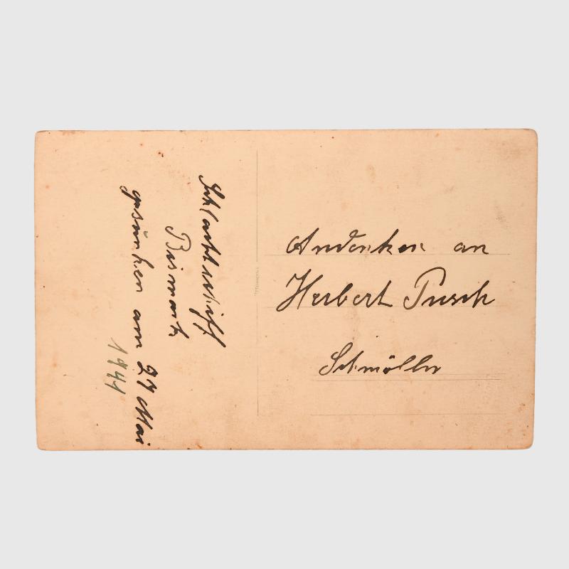Postcard size photograph of a member of the Bismarck wearing his Marine uniform, hatless. On the reverse side ‘Battleship Bismarck, sunk on the 27th May 1941’ with a partial address.