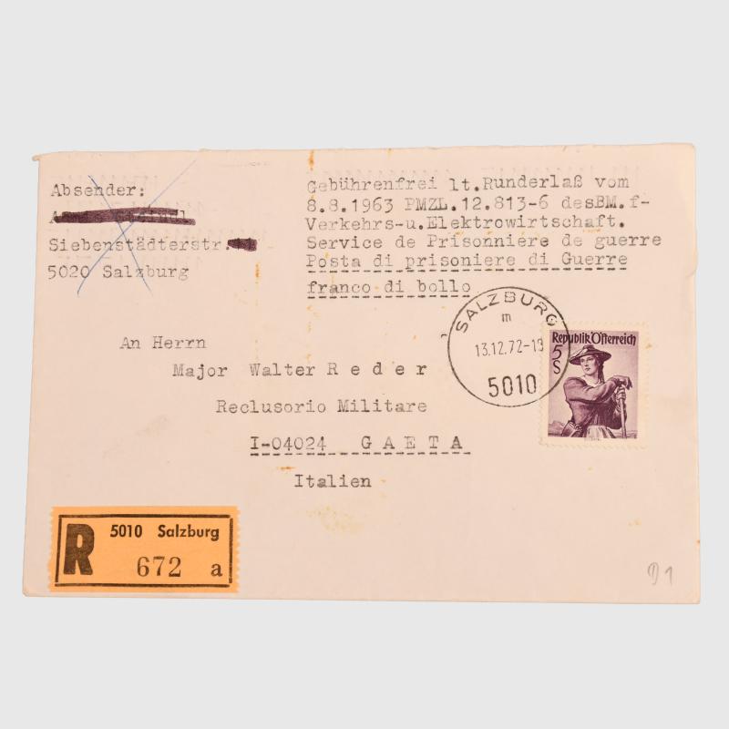 Walter Reder, a member of the SS Totenkopf Division, Austrian citizen, extradited to Italy in 1948 to stand trial for war crimes, sentenced to life imprisonment and was paroled in 1985. An original envelope carrying Walter Reder’s hand signature on the reverse, the envelope address to ‘Major Walter Reder’ at the Italian Military Prison he was being held in, the letter was written by a Austrian citizen in Salzberg asking for Walter Reder’s signature, which he duly did and posted the envelope back to Salzberg.