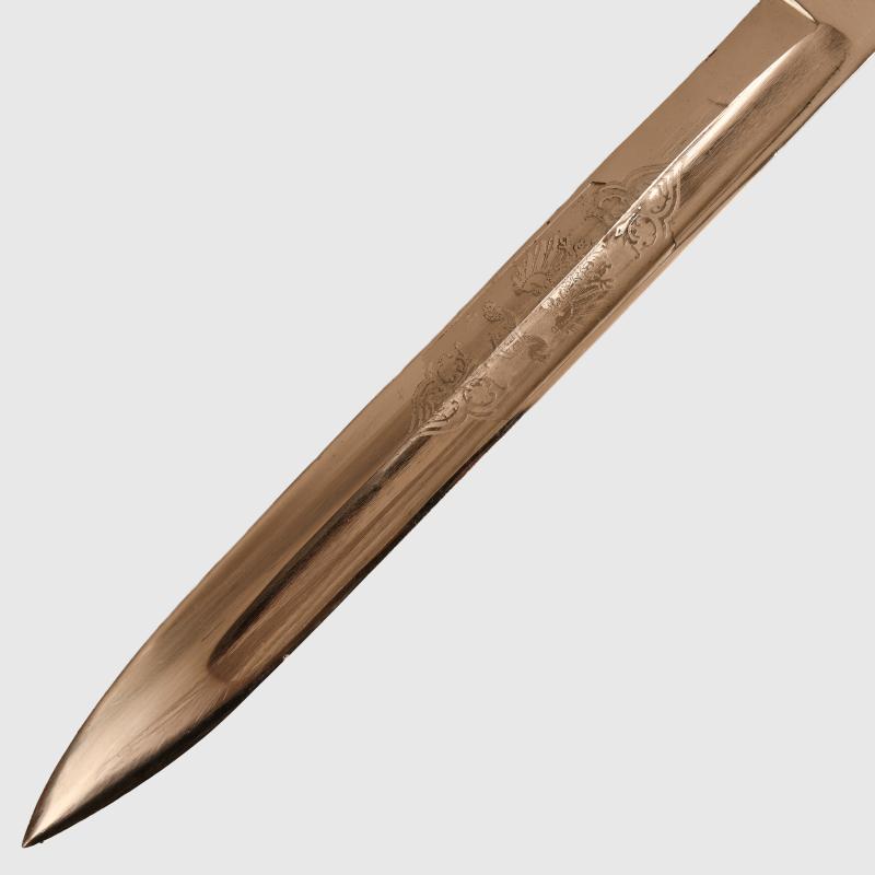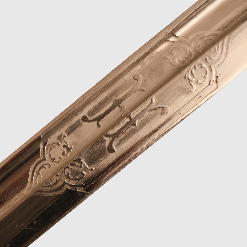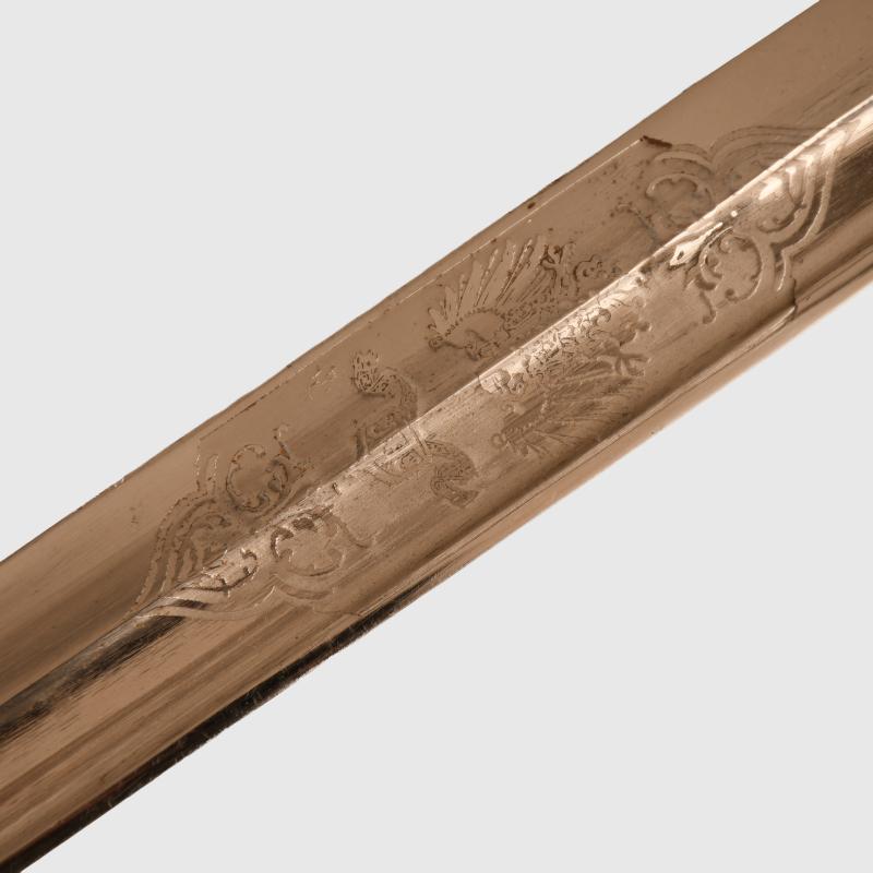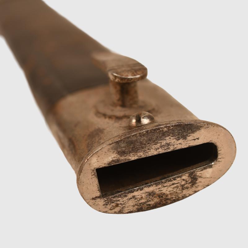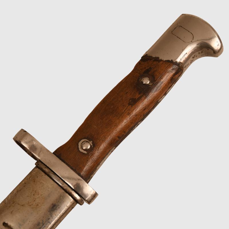 A very fine example of the Mauser 71/84 bayonet with excellent bright blade. To one side it has a panel with the Colonial style crown and ribbon with the Imperial style eagle below. On the reverse side a similar size panel with what appears to be two gothic letters F or K to the centre, this may represent the initials of the owner. The plating to the pommel, back strap and muzzle ring is thin in place. The wood grips are good, slightly discoloured, in its original leather scabbard, with its correct scabbard mounts all in nickel match to the bayonet. The sale of Knives, other Edged Weapons and Firearms are restricted to those aged over 18. Verification of age is required before purchase is concluded, this will include providing a scan of photo ID including your address and in some cases may require video verification by FaceTime or WhatsApp video, at Regimentals discretion, until formal laws on this requirement are enforced in the UK.