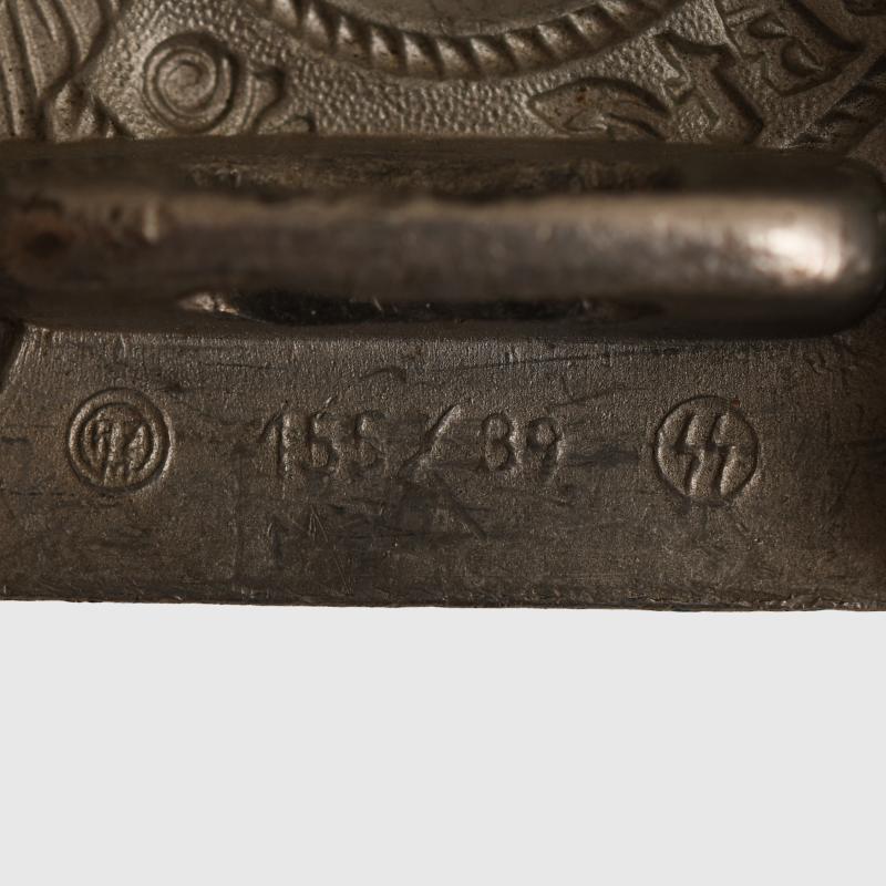 A good service worn aluminium buckle for the Waffen SS. Slight distortion at the join of the double pronged belt fixing system. Some loss of detail to the wreath surrounding the central swastika. Marked on the reverse ‘RZM 155/39 SS’ which is the Company of F.W.Assmann & Sohn. A good clean example.