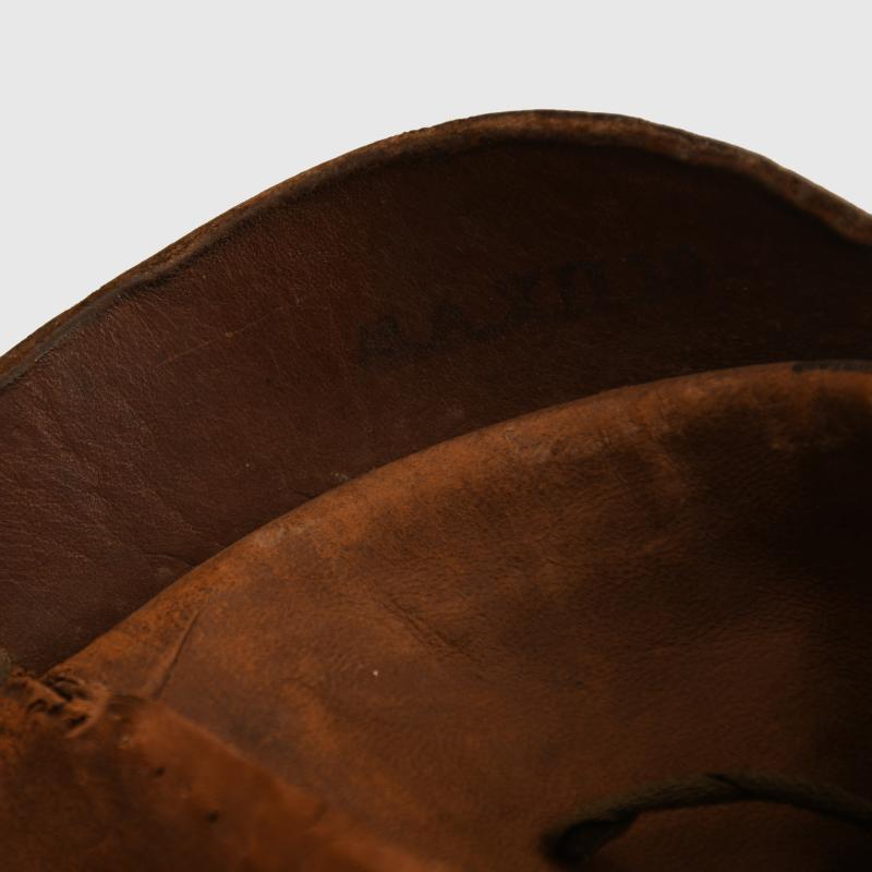 A super item, untouched since the end of WWI. All leather skull, rear peak slightly distorted but both peaks firmly attached with good strong stitching to the main body, we always mention this with pickelhaubes because the stitching does tend to rot over the intervening years. Slight surface rust to the removable spike with matching rust to the front peak trim. All of the fittings match in colour with their chemically patinated field grey finish. Complete with its non-serrated national and Saxon field cockades, which were mainly found on Saxon helmets, Hesse and Baden are sometimes found with non-serrated cockades. The chinstrap is still in the position where the helmet was being worn and is hanging down. To the interior the leather liner all complete and in nice condition with its original drawstring. A nice clear manufacturers ink stamp to the inner crown with a good clear date of ‘1916’. Very clearly ink stamped to the inner rear peak ‘B.A.XII.10’ this is the correct army corps stamping for Saxon Regiments 100, 101, 102, 103 and Schutzen Regiment 108, we are not quite clear of what the extra number 10 on the end of the army corps designation is standing for. Collectors maybe familiar with the name Michael Baldwin, the greatest field grey collector that we have known in 60 years of dealing, this helmet would have been ideal if Michael had still been alive, if he found a helmet like this with the strap still in place hanging down, that’s way it would remain in his collection and anybody wishing to build a collection of the quality and finesse of Michael Baldwin should have no hesitation in purchasing this item.