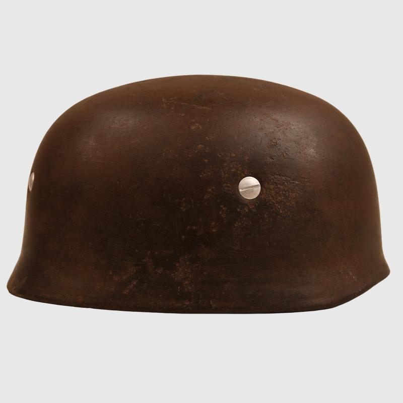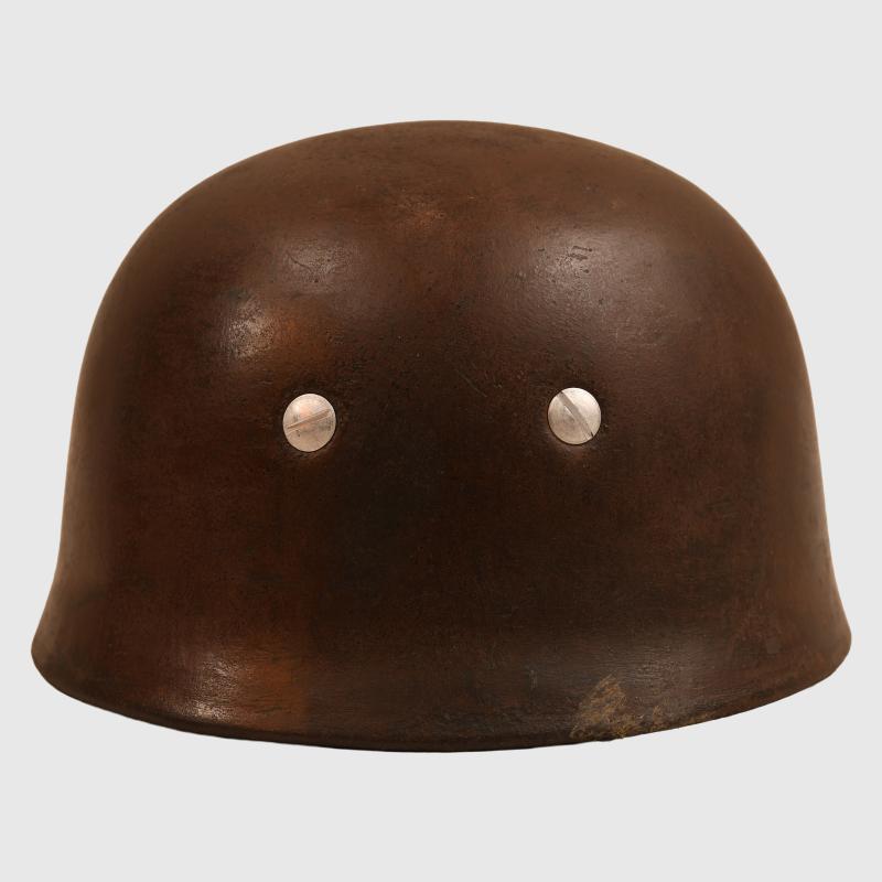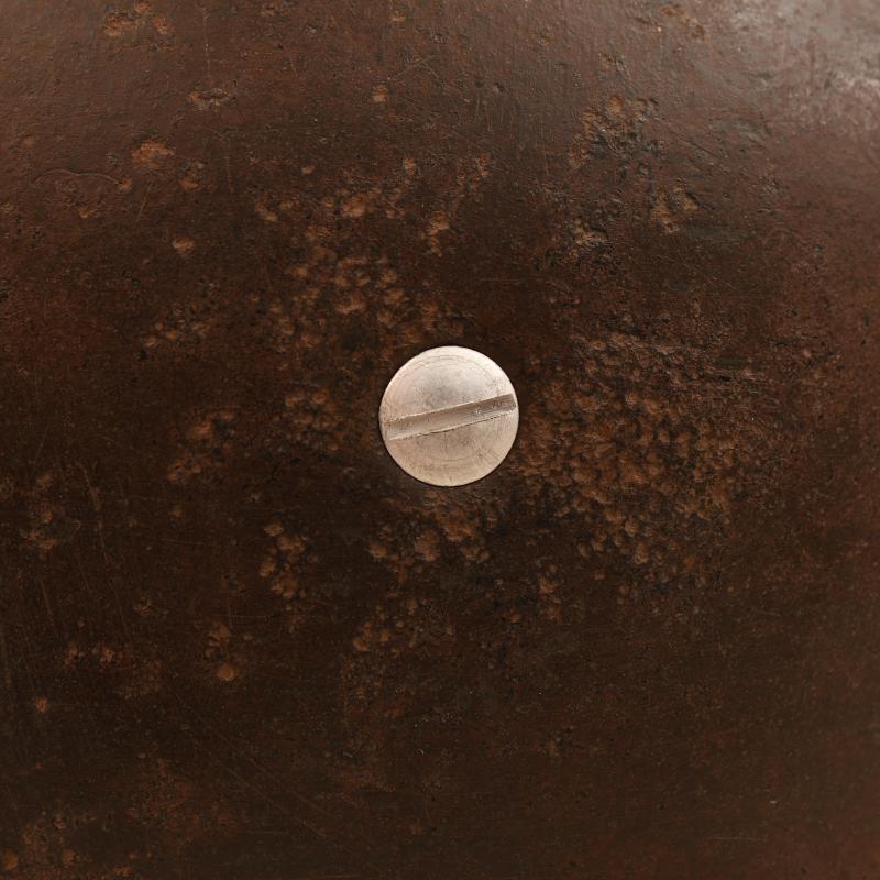 A reasonably nice example of a Luftwaffe paratrooper M.38 helmet shell. The corrosion to the interior of the bowl has obliterated the size stampings. The exterior is generally good with some minor corrosion with its Luftwaffe eagle still visible below a brown/maroon over-paint. A set of four of the late war slotted aluminium screws have been post war fitted. The liner is completely missing.