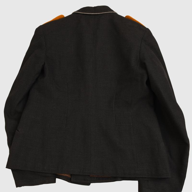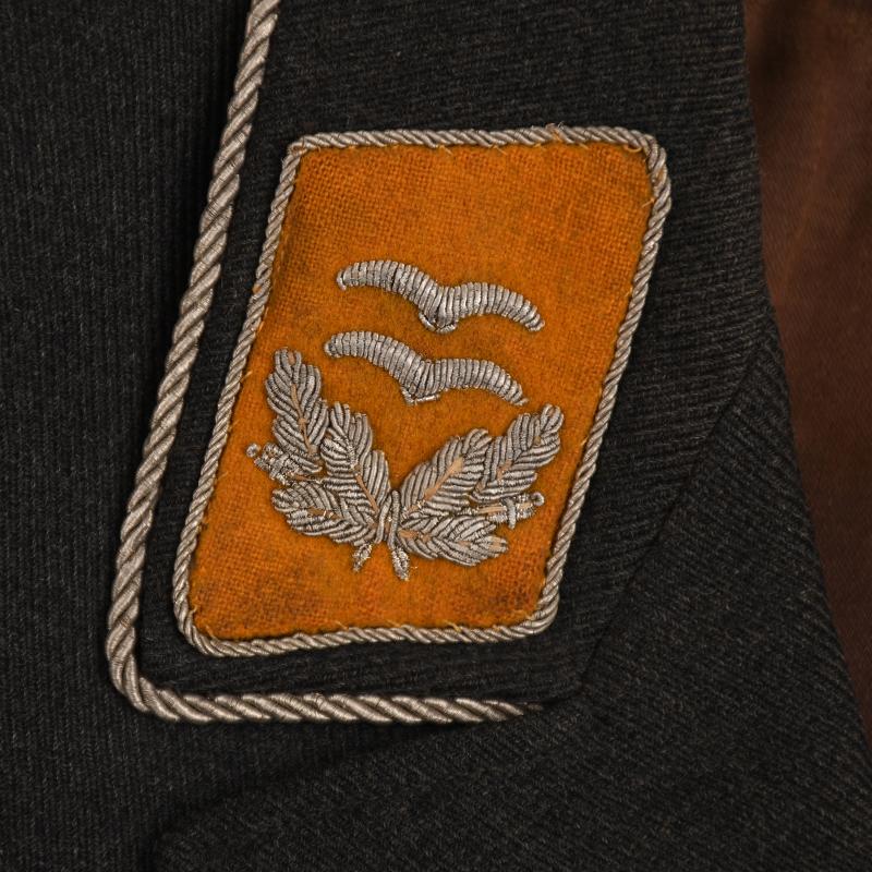 In our opinion one of the most elegant tunics of the German Luftwaffe of WWII, this medium size example in standard Luftwaffe blue grey ribbed officers quality cloth. One small repaired moth hole at the lower front skirt. Four button, fly front closure, standard open collar with officers silver cording to the collar, some wear to the inner collar in this area. Yellow based Luftwaffe Oberleutnant’s shoulder boards and matching bullion wire on yellow collar patches. A very nice quality Luftwaffe officers breast eagle with early droop tail configuration. Loops for two short medal ribbon bars and one award. A tailored hole through the lower left hand pocket, with its integral strap and D ring for the placement of the Luftwaffe sword or dagger.