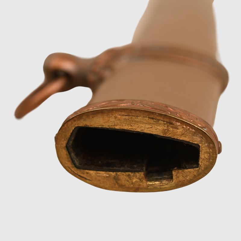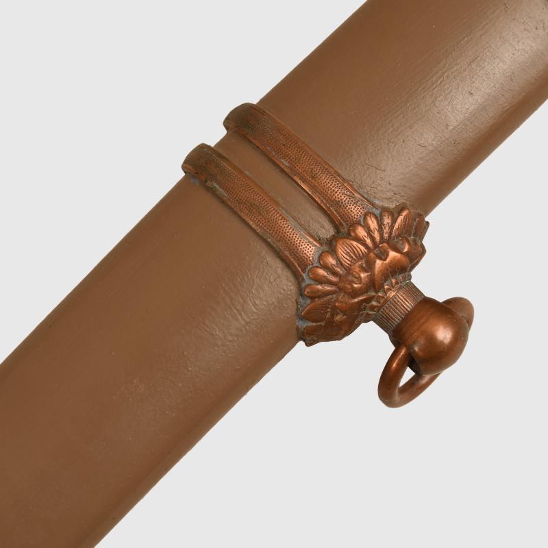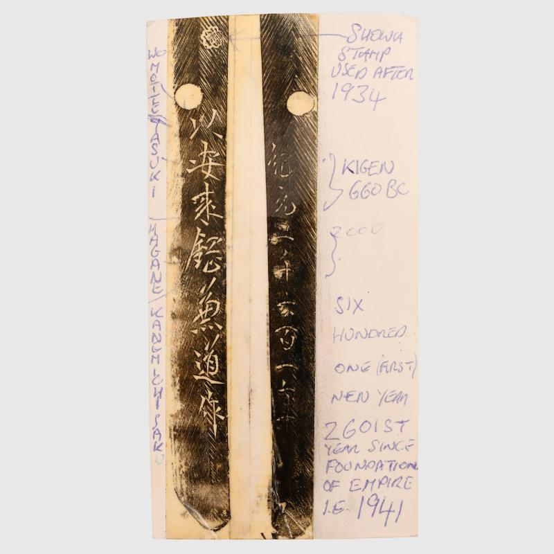 A very nice 66cm Showa period blade, which is devoid of any chips. There is a very faint view of the wavy Hamon. The tang is complete with a Showa stamp, which is standard on any blades made after 1934. The actual date of manufacture of this blade is 1941, it has a 7 character signature. Fitted into its standard military mounts, the cloth wrapping for the ray skin covered hilt in nice condition with slight wear, no fraying to the top binding. All of the fittings are complete within the cloth binding. The sword is with its tassel ring. All of the washers that hold the tsuba (cross guard) to the blade are complete, none have been lost. The scabbard paint is excellent. The sprung loaded button that holds the sword firmly in the scabbard is all complete and working correctly. A very nice example of a Japanese army officers sword of WWII. More extensive, extra images can be seen on our new Premium website, type in regimentalsmilitaria.co.uk in to your web browser.The sale of Knives, other Edged Weapons and Firearms are restricted to those aged over 18. Verification of age is required before purchase is concluded, this will include providing a scan of photo ID including your address and in some cases may require video verification by FaceTime or WhatsApp video, at Regimentals discretion, until formal laws on this requirement are enforced in the UK.