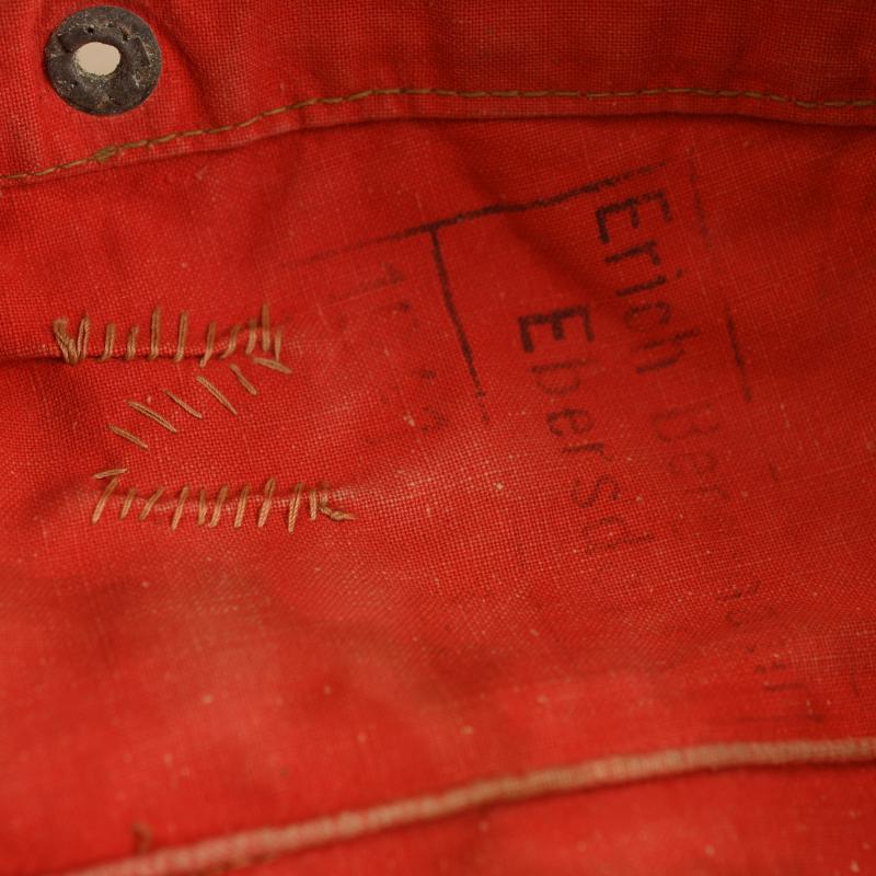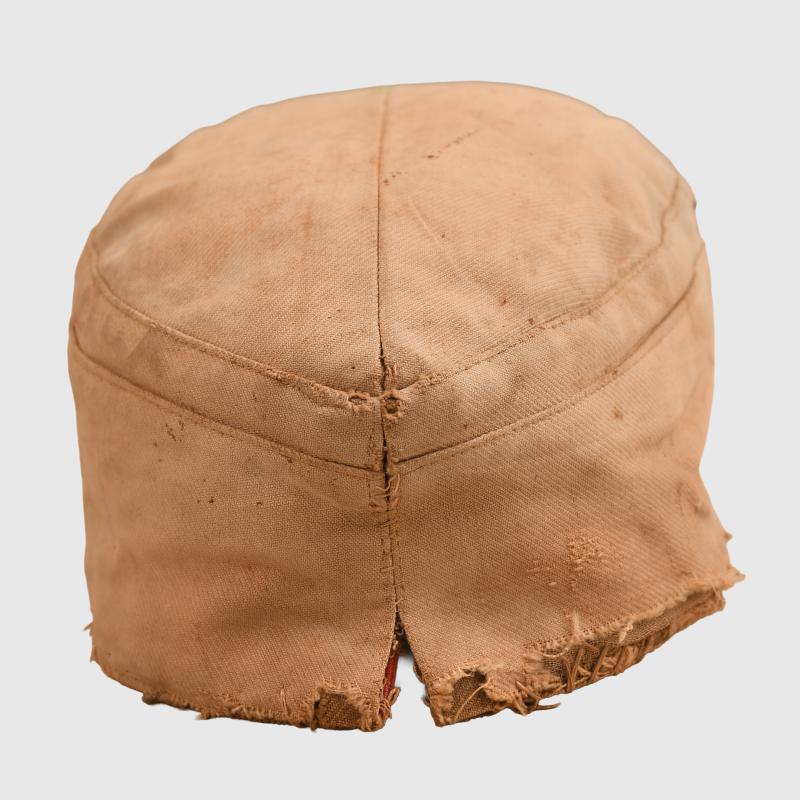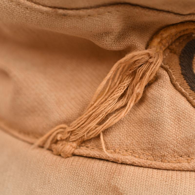 A superb, medium size, bleached to white, M40 visored field cap with lemon yellow soutache (waffenfarbe) for a Signals unit. Stiff, heavyweight, tan coloured material with much age, nicks and tears. The cap holds form when upturned as we often see with these well worn examples. The cap has its untouched, first pattern tropical bevo eagle and matching roundel. The yellow russia braid (soutache) is stitched through the lining, as often seen with these caps, the lower sections of the thread is frayed, pulling back the soutache, reveals the original dark shades of the olive drab material colour from when its been protected from sun bleaching. The red interior lining shows the expected wear and the usual sweat stains to the front brow area. The soldier has stitched in to the lining, what appears to be a Z or N, likely an initial for easy identification. The thread used for this is matching various field repairs. The maker mark is clear to the rare maker of Erich Bergmann and dated 1941. Interestingly, this is the 4th example of Erich Bergmann with Yellow, Signals waffenfarbe we have obtained here in the UK, 3 of which have all come from the County of Surrey. One can assume a British unit captured a Signals unit during the Africa Campaign and all the troops took souvenirs home.