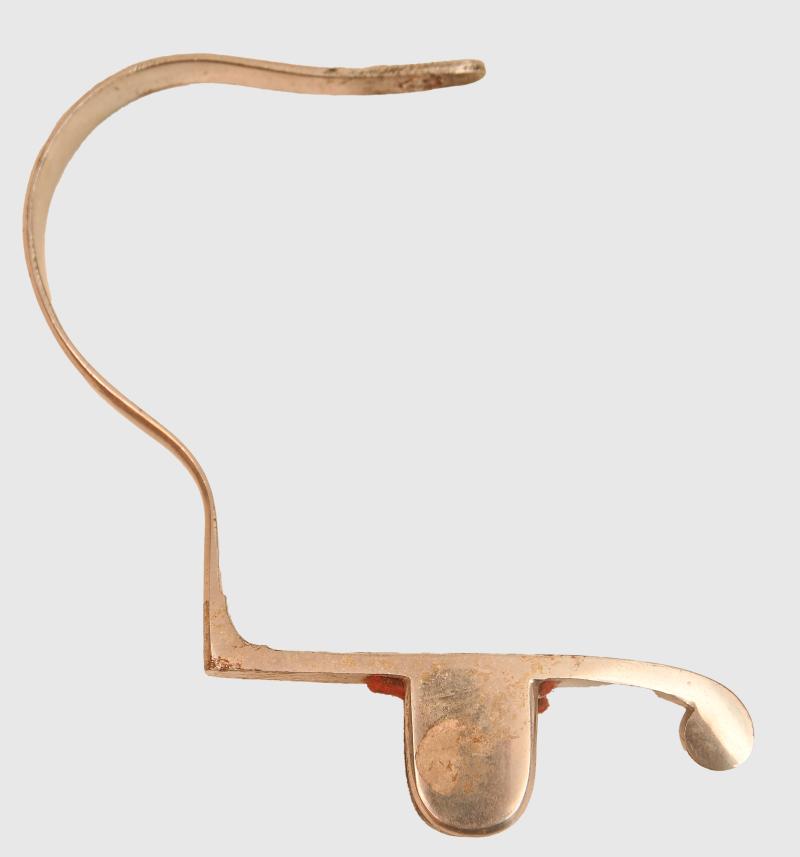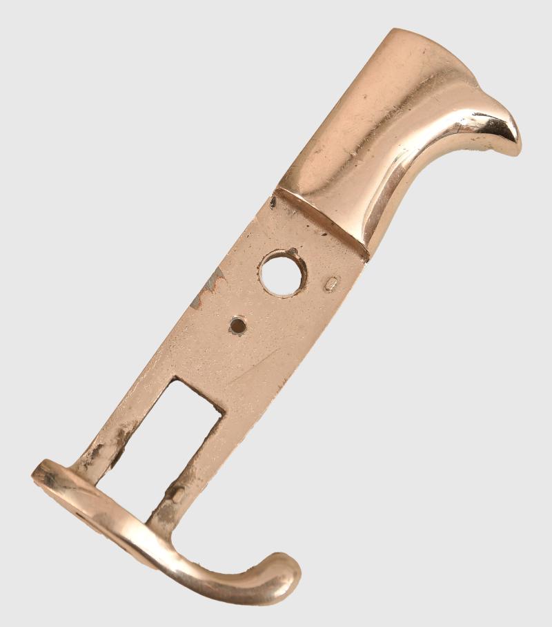Black version with all finish missing showing its brass base with original pin, hook and hinge. Some slight green residue on the reverse side which has been a reaction against the leather belt it has been fitted to for the last 80 years. read more