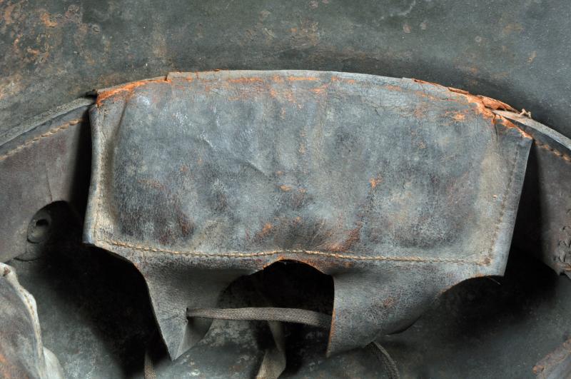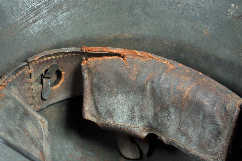 A good example of an SI66 marked helmet, very faint traces of camouflage finish remaining, all original rivets. The M.16 liner band all in place with its three leather pads, all of which have their inner horsehair pads complete. The leather liner band has rotted around the front left hand rivet subsequently causing the liner band to be loose within the inner bowl. Two of the leather pads are slightly split at their join with the main leather liner band. All three have their inner horsehair pads.