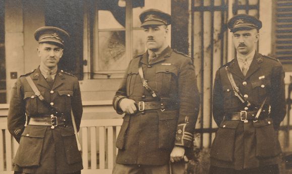 Two very well framed items, both having typical turn of the century style frames. The first one is originally framed at the time and has an excellent framers pasted address to the reverse of the frame and the image is of Hugh Clay Carter Machine Gun Corps, and dated '1919', he can clearly be seen wearing the Military Cross and Machine Gun Corps collars to his whipcord tunic and he appears to have two pips or a crown and pip upon each epaulette. The other photo is a typical officer grouping showing the Colonel to the centre in cuff rank tunic and flanked by two Machine Gun Corps officers being a Lieutenant and a Captain, these appear to be Canadian Machine Gun Corps troops and have divisional signs for each arm, which are forward pointing arrows with a bar underneath. This should be relatively easy to research.