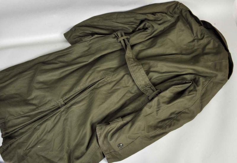 Olive drab fully lined raincoat, label reads ‘Small Regular Overcoat Mans’ with removable inner liner. Arm pit to arm pit 1.45cm, arm pit to cuff 110cm and back of neck to hem is 51cm.