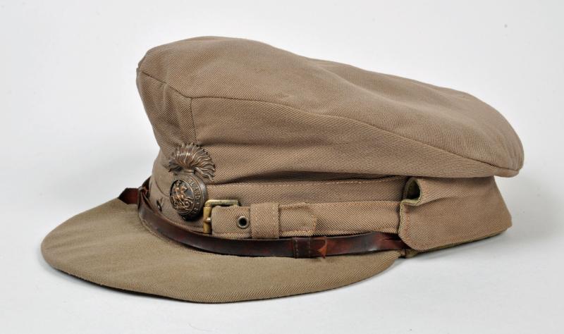 A very rare cap being the Gor Blimey style cap for officers with the pull down side curtains, constructed in Gabardine material very similar to the tropical lightweight tunics produced by tailors during the First World War. Complete with its correct chinstrap, leather football side strap buttons, Royal Northumberland Fusilier officers bronze badge fitted, with its sweatband in leather stitched in a half moon pattern just inside the forehead area. The remainder of the interior liner in lightweight linen with the typical lozenge style stitching of the period. More extensive, extra images can be seen on our new Premium website, type in regimentalsmilitaria.co.uk in to your web browser.