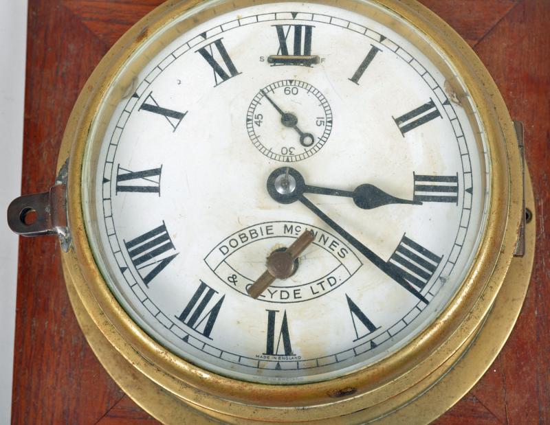A brass bulkhead clock with a 12 hour dial in Roman numeral, second hand present with the name of ‘Dobbie McInnes & Clyde Limited’ to the face. The clock would appear to be inoperable at the present time, it is placed on a wooden wall board. It would appear that Dobbie McInnes were nautical and instrument makers and contractors to the British Admiralty.