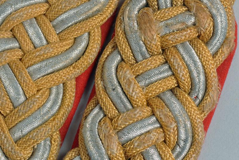 A service worn set of the full bullion gold and silver wire shoulder board for an Army General Major. Stitches remain where they have been removed from a tunic. Some slight shredding to the gold thread on one of the shoulder boards