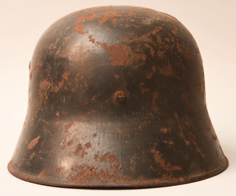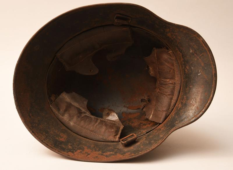 A now very difficult to find helmet being the M.16 style helmet, this originally being an Austrian helmet re-issued in the Third Reich period to a police unit. Both of its decals complete with minor abrasions as can be seen by our images. Surface rusting in areas again, which the images highlight but a good degree of original paint remaining. To the interior the metal banded three section liner all intact with the exception of the front pad having the tips of the two tongues broken away. All three of the interior liner pads have their inner horse hair pads, strap missing.