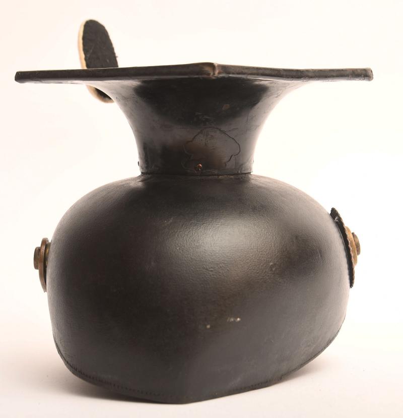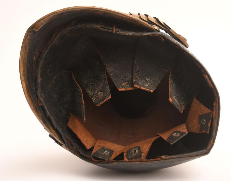 A very nice all leather bodied with tin non removable top for an enlisted man in a Saxon Reserve Uhlan Regiment. Leather body excellent, complete with its Saxon Reserve enlisted ranks plate, basic gilt brass with nickel Coat of Arms of Saxony over a Reserve Cross. Correct white and green Saxon field cockade fitted to the tin mortar board top. To the right hand side of the helmet as the helmet is worn the national black, white and red enlisted ranks cockade. Brass front peak trim. To the interior the 10 tongued liner is in place, the tip of one tongue has broken away, the lower edges of the liner has suffered slightly from leather rot but this is stable and will not deteriorate further. The liner is all in place correctly. Standard clip over domed chinscales.