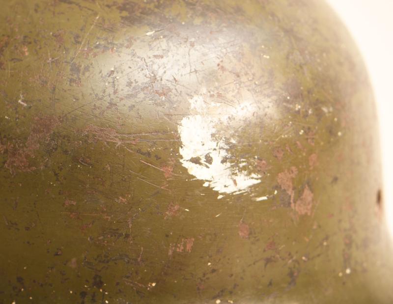 A very early M.40 single decal combat helmet, shell size and maker unfortunately obscured but a small size, painted in the early apple green finish, therefore it must be an early period M.40. The single decal with heavy abrasions as can be seen by our web images, some other minor markings. To the interior the 1940 pattern zinc banded liner with the remains of the leather liner.