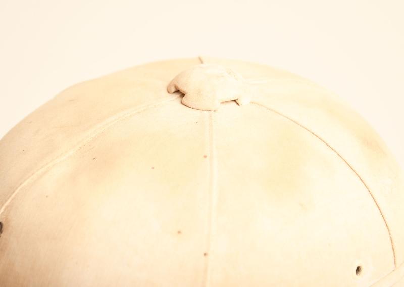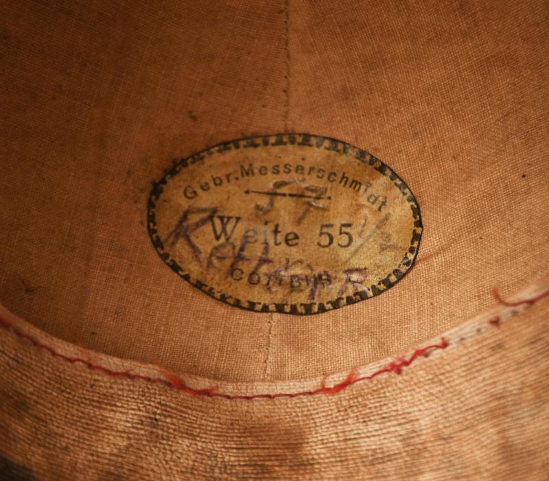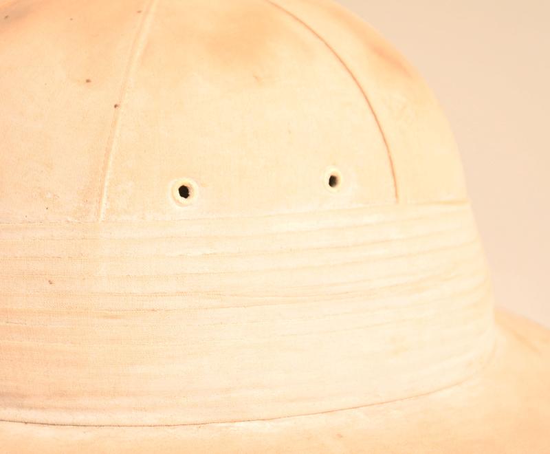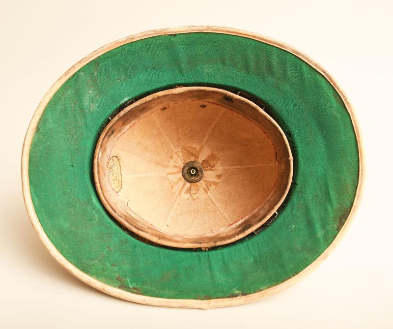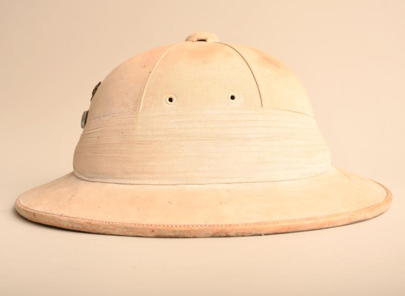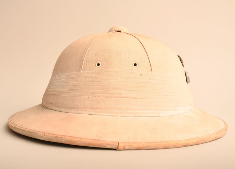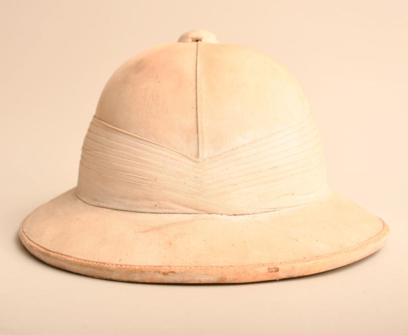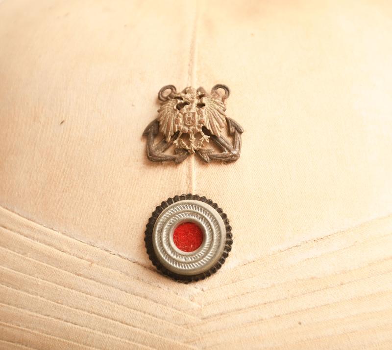 A rare tropical helmet being a cork constructed helmet with six panel crown, pagri, white leather trimmed having the badge at the front for the Colonial Naval Administration Branch with a single cockade fitted. The inner base of the headdress is lined in a green lightweight cotton, complete with its inner grained leather sweatband with its inner silk missing. The label to the interior Gebr.Messerschmidt head size ?55 Cottbus with an unidentified name applied to the label. The liner is slightly loose from its metal mounting brackets to one side.