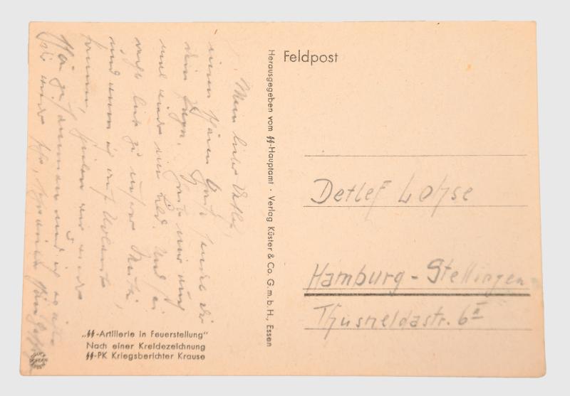 A printed pencil illustration of an SS artillery unit with a PAK 38 artillery gun in action. Used, pencil message.