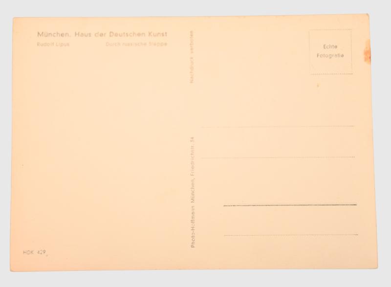 Unused condition with one slight stain to left hand side. Depicting an illustration by Rudolf Lipus of a bedraggled marching squad of soldiers wearing their zeltbahns as capes, advancing on the Russian front, reverse inscription reads “ Munich house of German arts”.