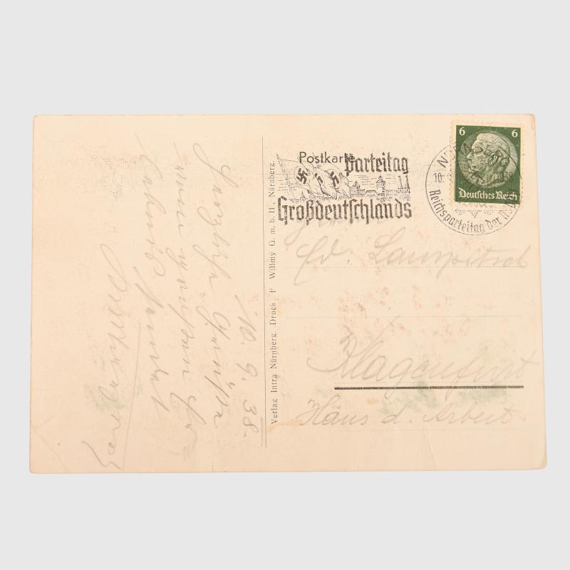 A black-and-white photo postcard 1938, showing the Zeppelin field at night illuminated during the Reich party rally, stamped and franked Nuremberg with pencil message and address.